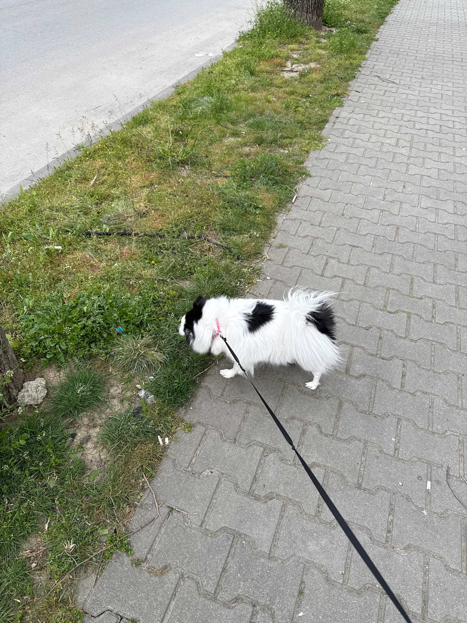 A small, black and white dog is on a leash, standing in a grassy area adjacent to a paved sidewalk. The sidewalk is constructed of gray interlocking pavers. The grassy area has patches of dry, brown g…read more