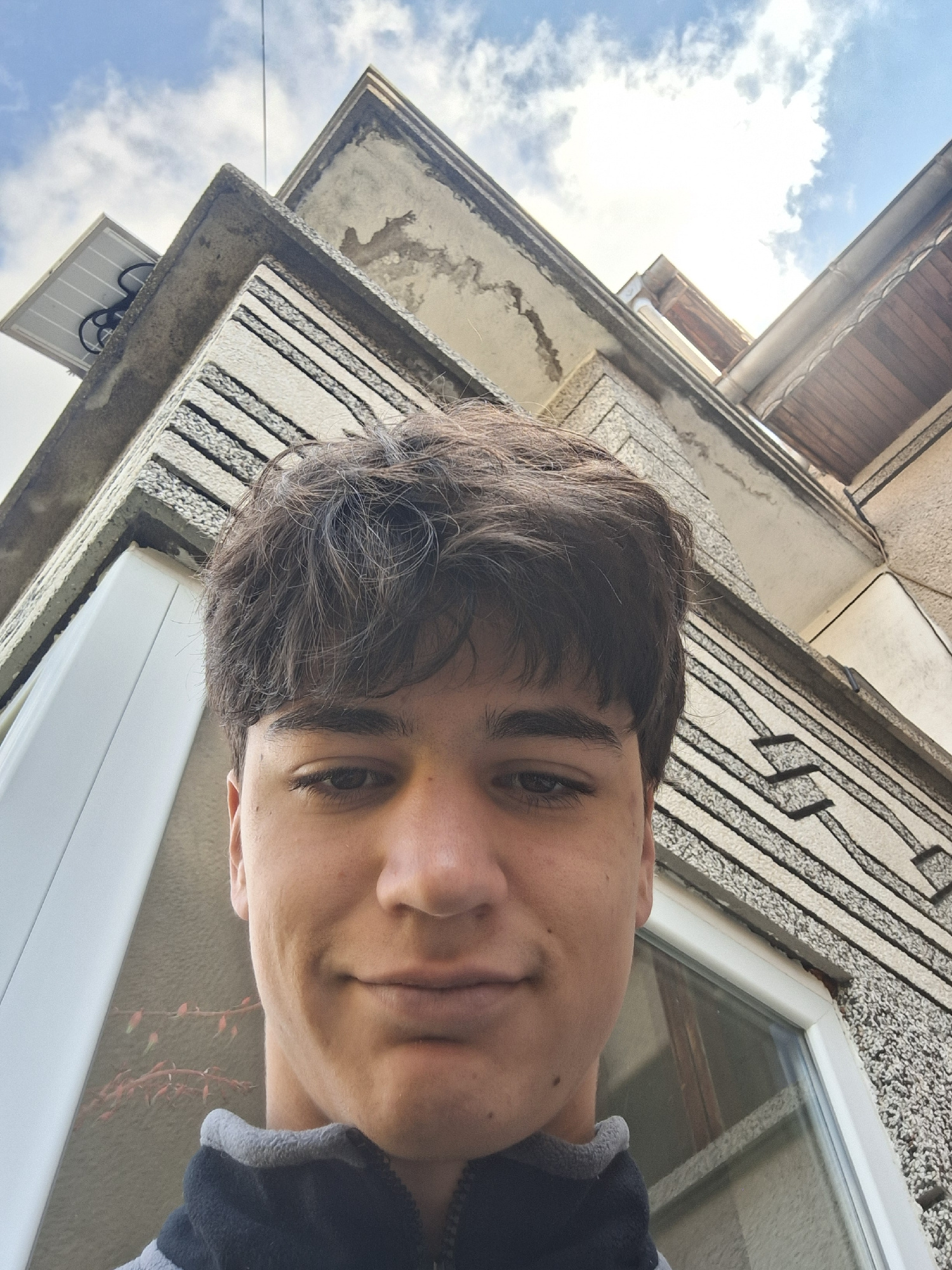 The image is a low-angle selfie of a young man with dark hair and light skin. He is smiling slightly. He wears a black and grey hooded jacket. The background includes architectural features suggesting an urban environment. There's a window frame, and textured wall surfaces. Above him, portions of what appear to be roof structures are visible against a bright sky with scattered clouds. A solar panel is mounted on one of the roof sections. The presence of specific architectural details and roof-mounted solar panels would be consistent with a city like Stara Zagora, Bulgaria. However, without further contextual clues or specific identifiers in the image, definitive confirmation of that location is impossible. | Open Wire