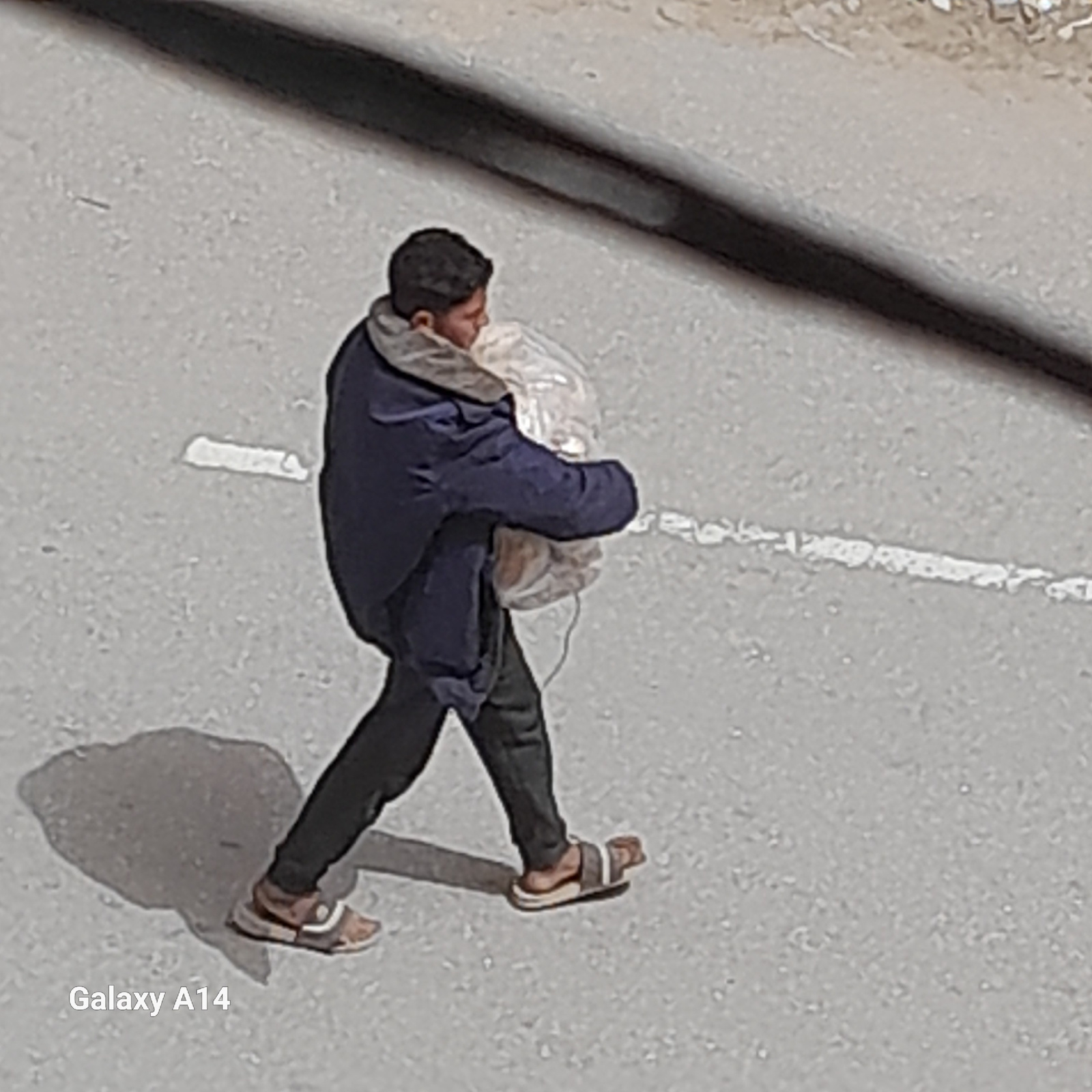 A high-angle shot shows a person walking on a gray road in Khan Yunis, Palestinian Territory. The individual is wearing a blue jacket with a gray hood, dark pants, and sandals. They are carrying a bag…read more