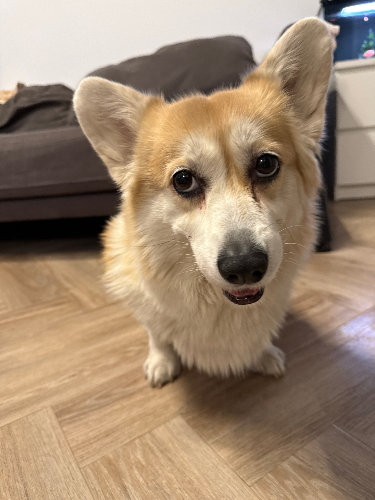 A close-up, high-angle shot features a corgi dog with light brown and white fur. The dog is sitting on a light brown, wooden floor. The dog is looking upwards with a slight head tilt. Part of a dark g…read more
