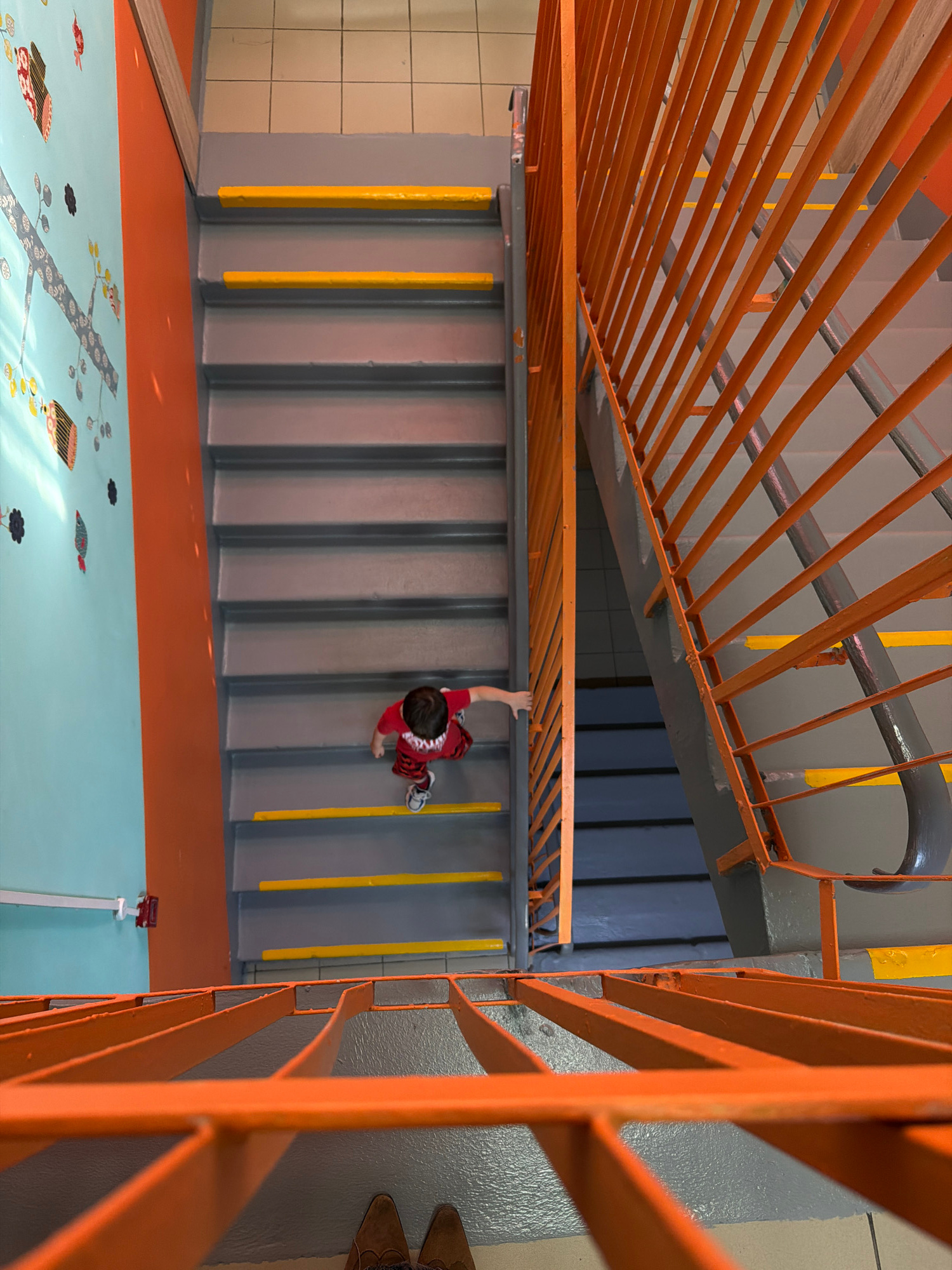A high-angle shot looks down a flight of stairs in Khimki, Russia. The stairs are grey with yellow stripes near the edges. A child in a red shirt and patterned pants is midway down the stairs, facing…read more