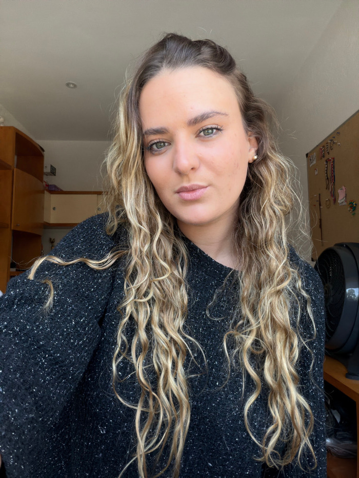 A fair-skinned woman with green eyes and wavy blonde hair wearing a dark, sparkly sweater poses at a slight angle. The background shows a wall with a few decorative items and a light-colored cabinet o…read more