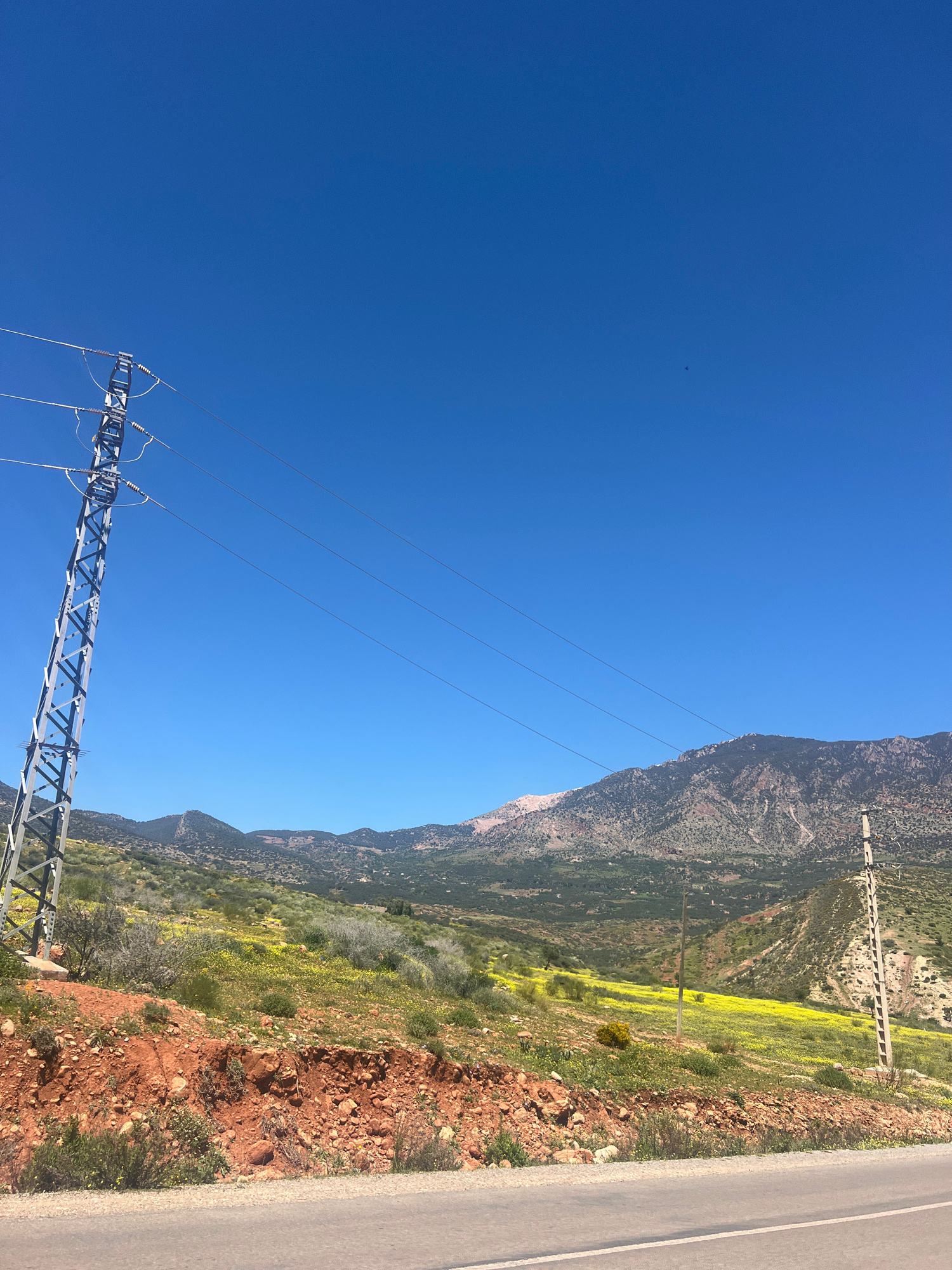 The image shows a clear blue sky above a mountainous landscape in Ouaouizert, Morocco. An electricity pylon is visible in the lower left corner, with power lines stretching across the frame towards th…read more