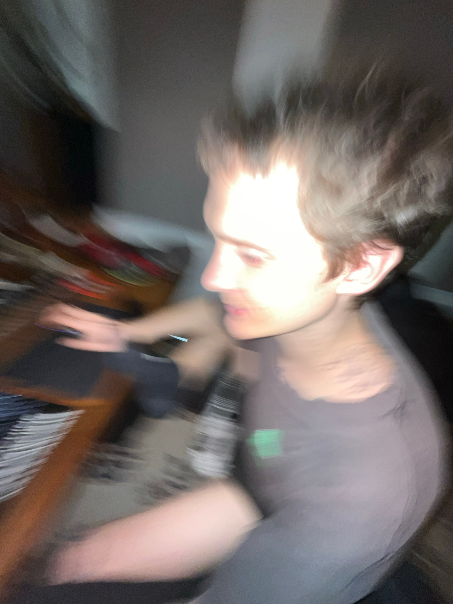 This media file presents a highly blurred and tilted image of a person, likely captured indoors. The significant motion blur throughout the image suggests either rapid movement of the subject or the c…read more