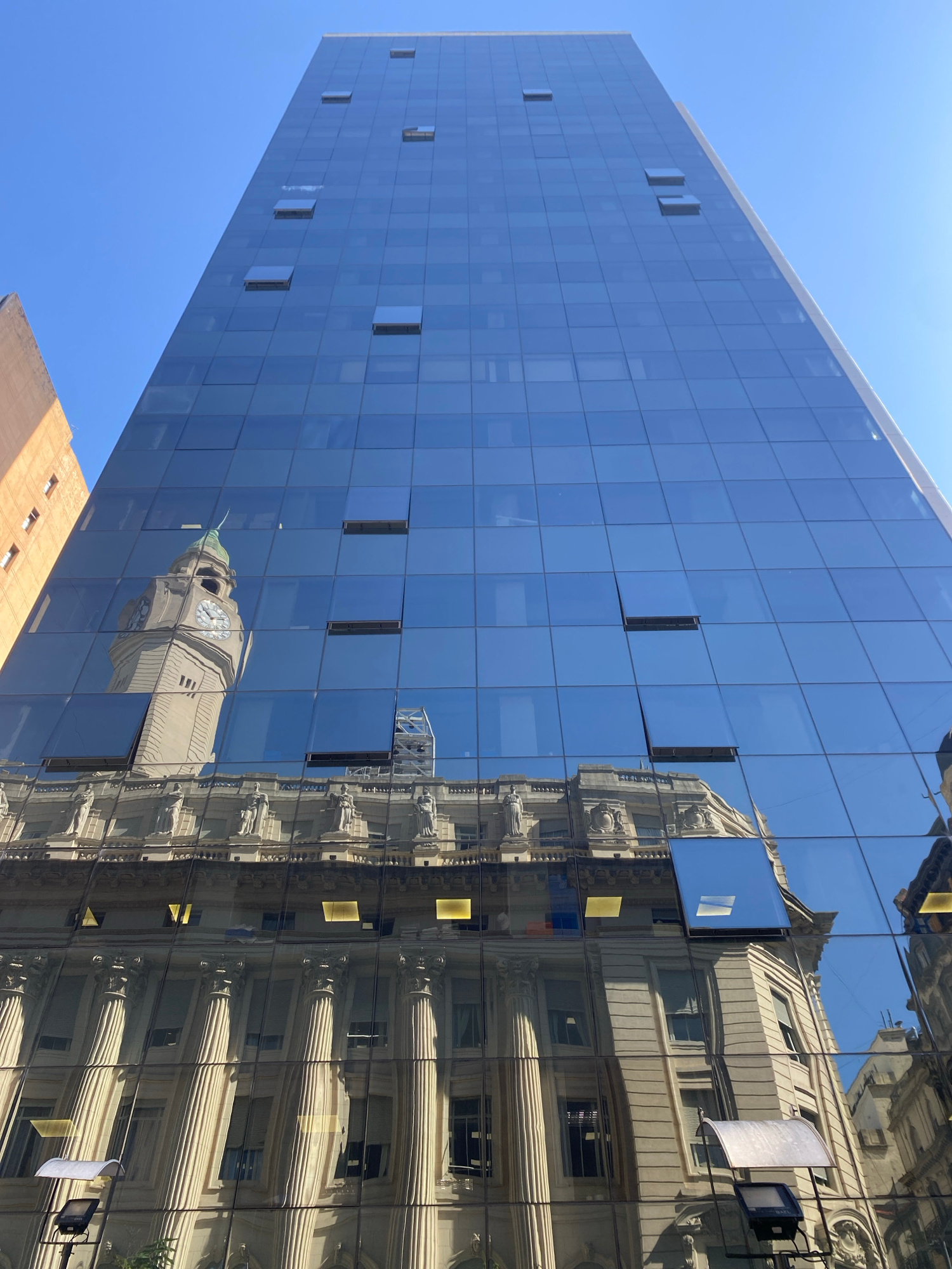 A low-angle shot captures the facade of a modern glass building. Its blue mirrored panels reflect the image of a classical-style building with architectural details like columns and ornate window frames, including a clock tower with a green roof. Some windows on the glass building are ajar. The sky is blue. This image is likely located in Buenos Aires, Argentina, due to the presence of classical buildings that are typical in the area. | Open Wire