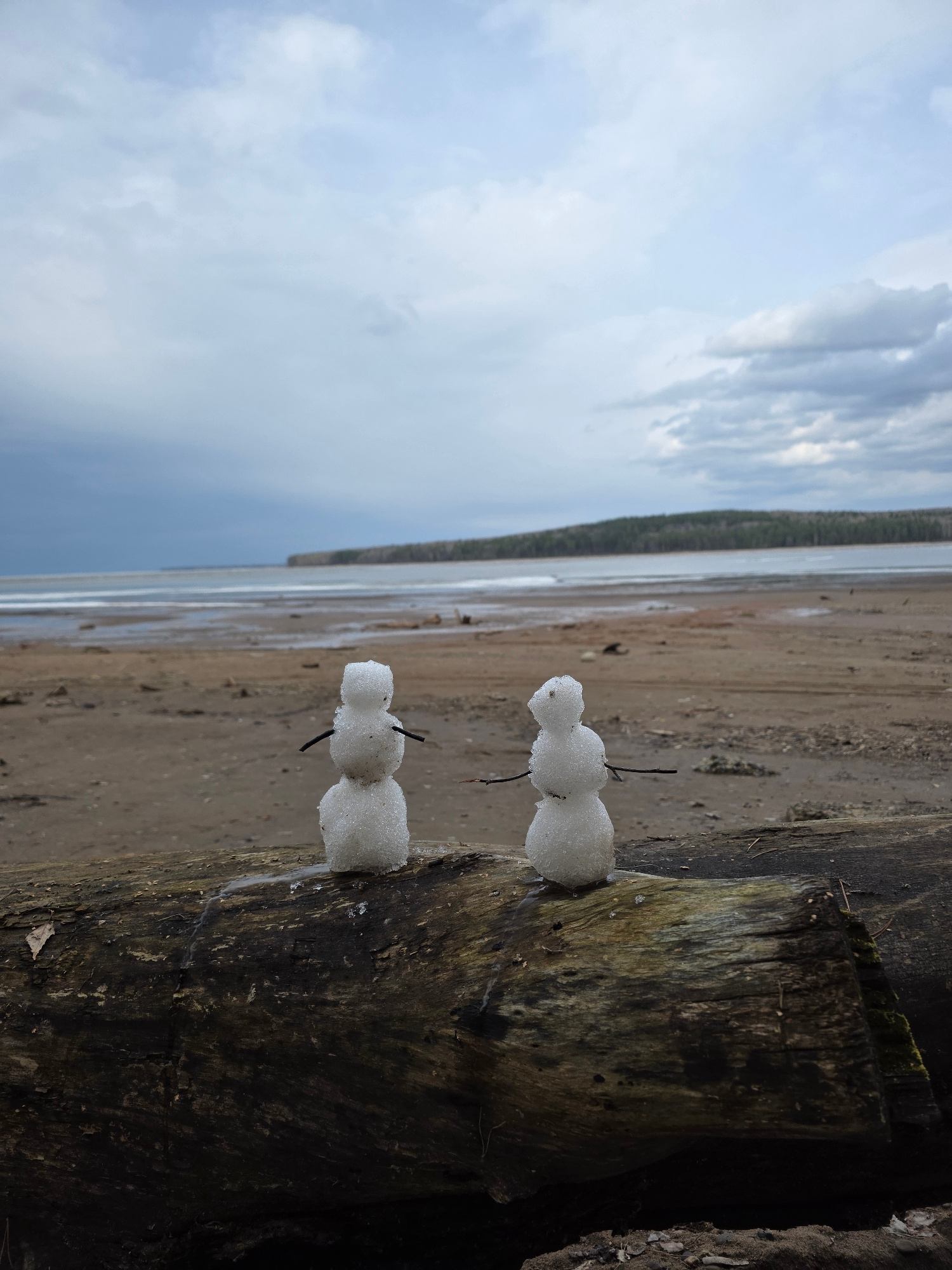 Two small snowmen are perched on top of a weathered tree stump. The scene is a beach setting on a cloudy day with the sky visible in the background. The location is Chaikovsky, Russia.