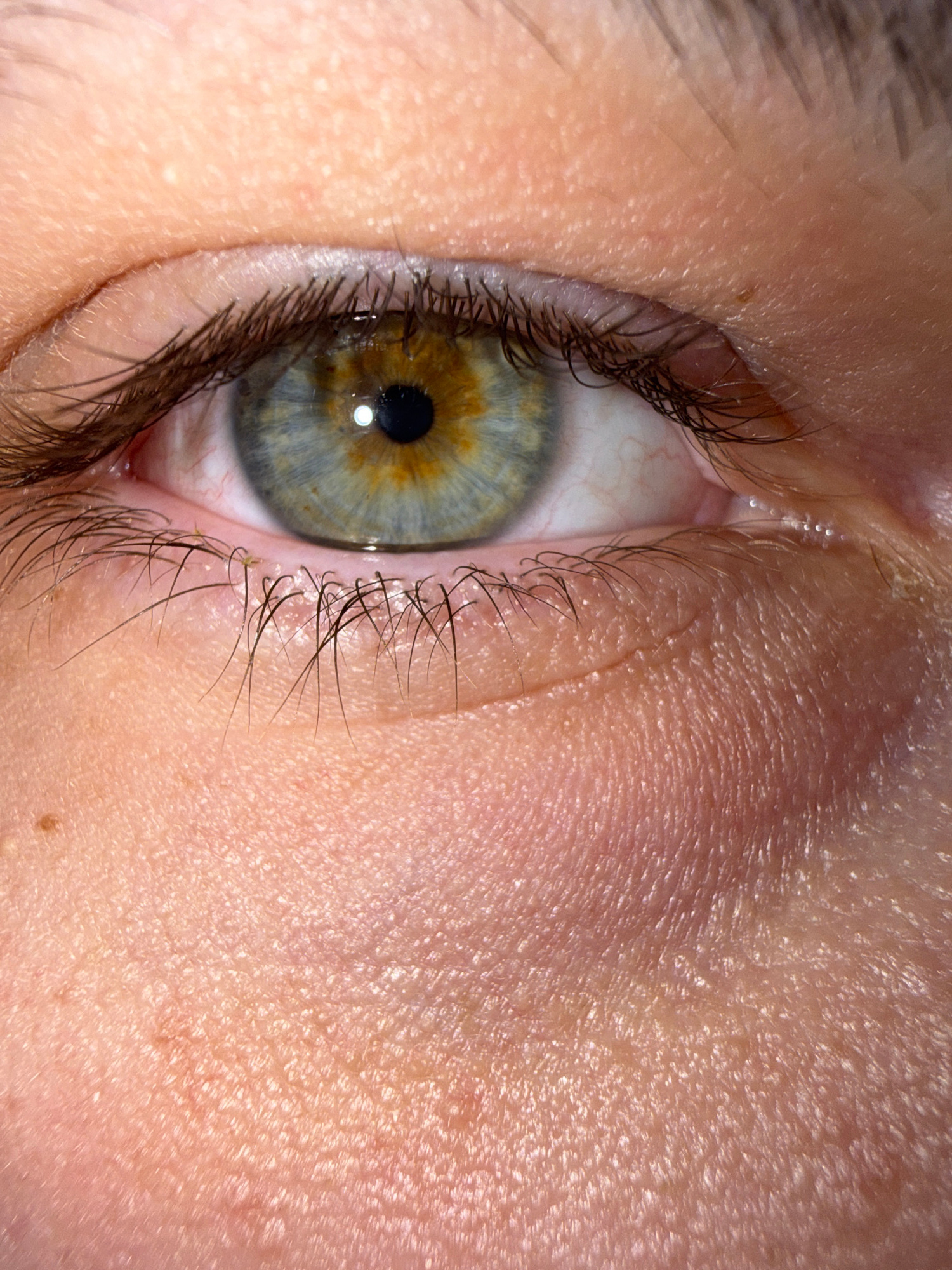 The image is a close-up of a human eye. The iris is a hazel color with a mix of brown, green, and blue. The pupil is black. The surrounding skin is pale and textured. The eyelashes are dark brown. The…read more