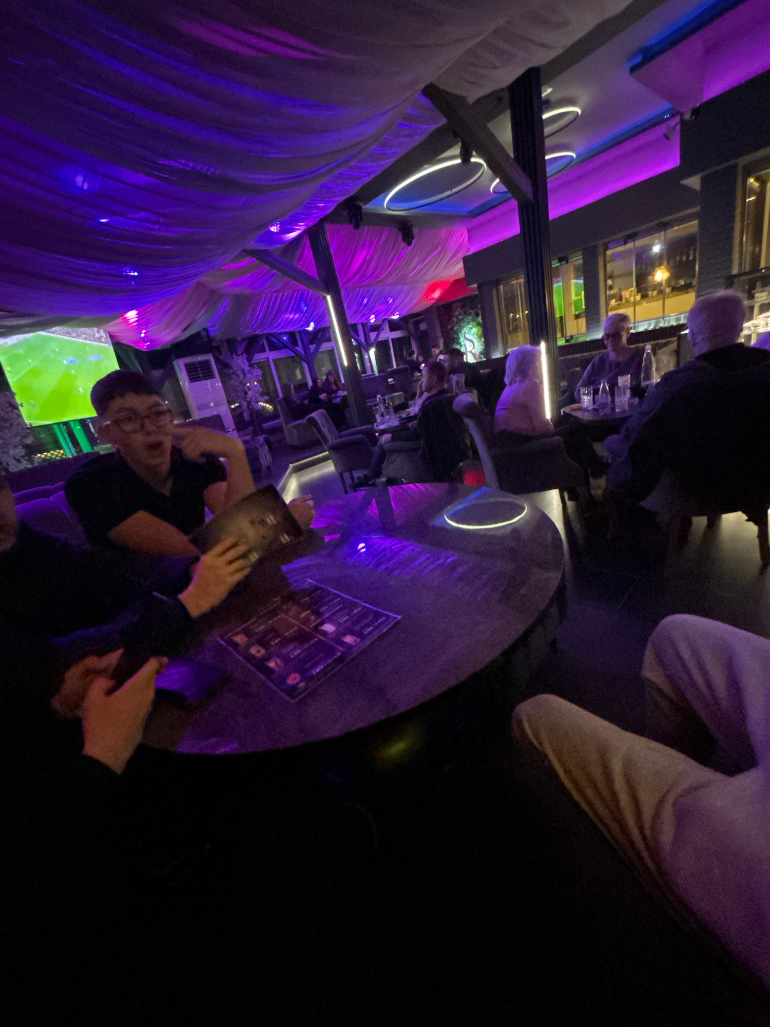 The image depicts an interior scene, likely a bar or lounge in the city of Zlatograd, Bulgaria. Several people are present, some sitting at a round table illuminated with a ring of light. A person is…read more