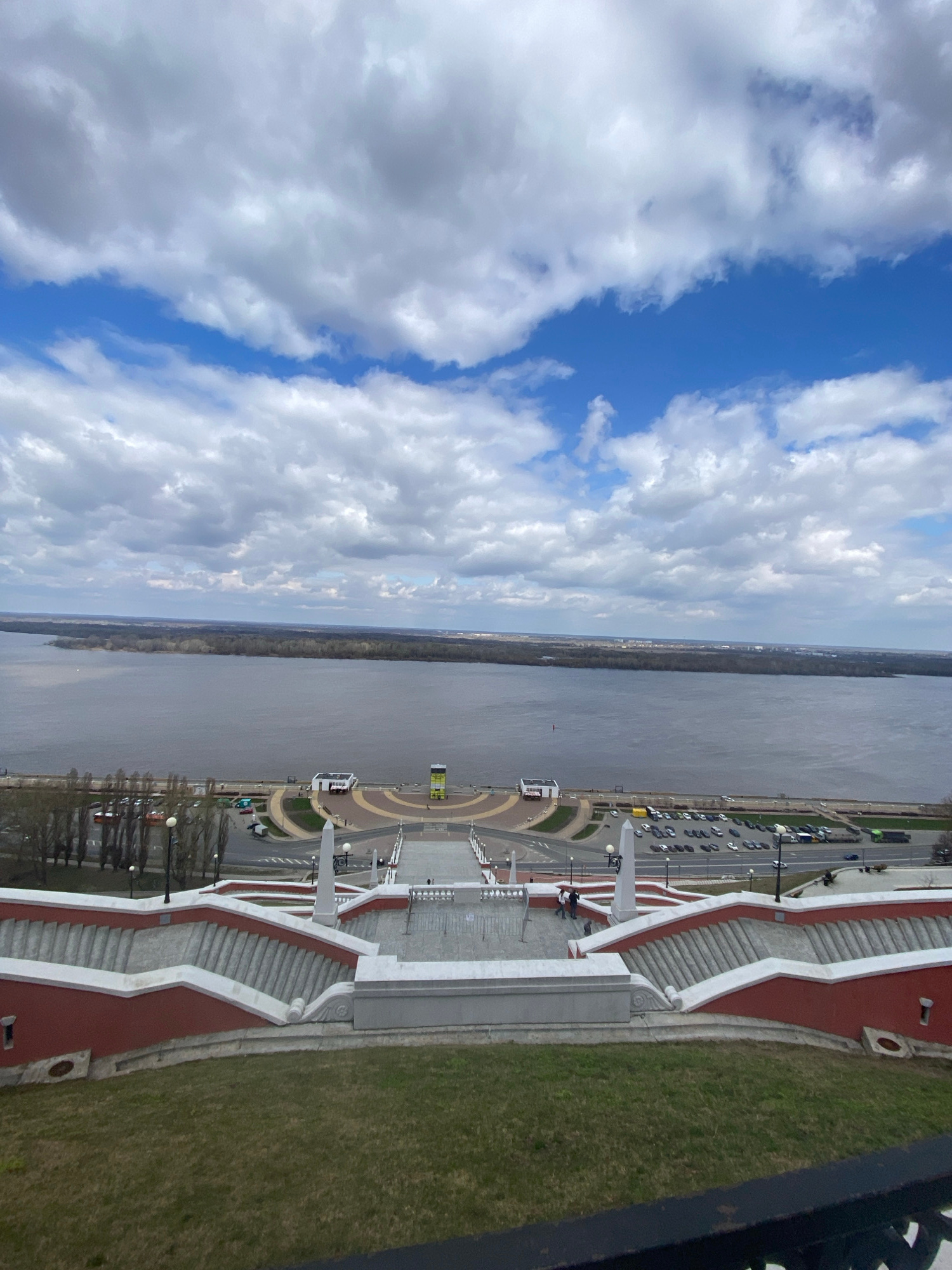 This image, viewed from an elevated perspective, captures a scenic view of a wide river, a grand urban embankment, and a partly cloudy sky in Nizhny Novgorod, Russia. In the foreground and to the rig…read more