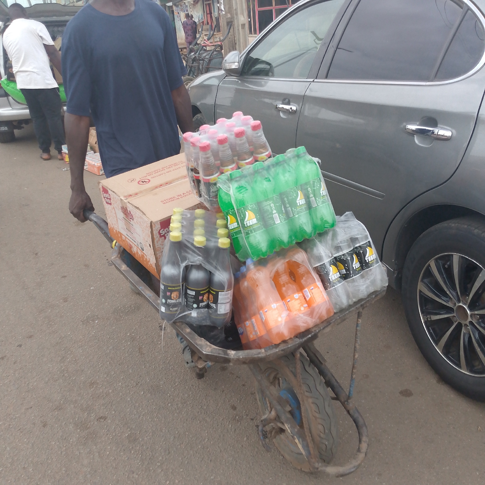 A man in Bukuru, Nigeria, is pushing a wheelbarrow filled with soft drinks. He is wearing a blue t-shirt. The wheelbarrow contains a cardboard box and several multi-packs of bottled drinks, including…read more