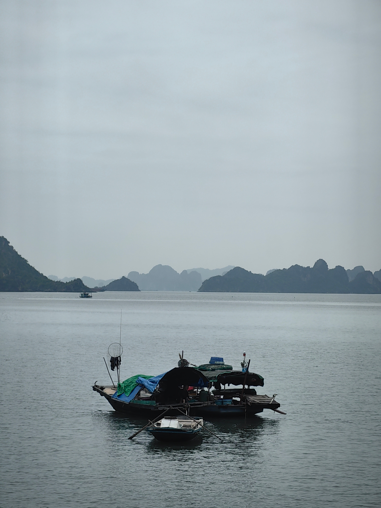 The image captures a serene, overcast scene in Ha Long Ward, Vietnam, characterized by a muted palette of greys, blues, and greens. In the foreground, slightly to the right of the frame's center, is a…read more