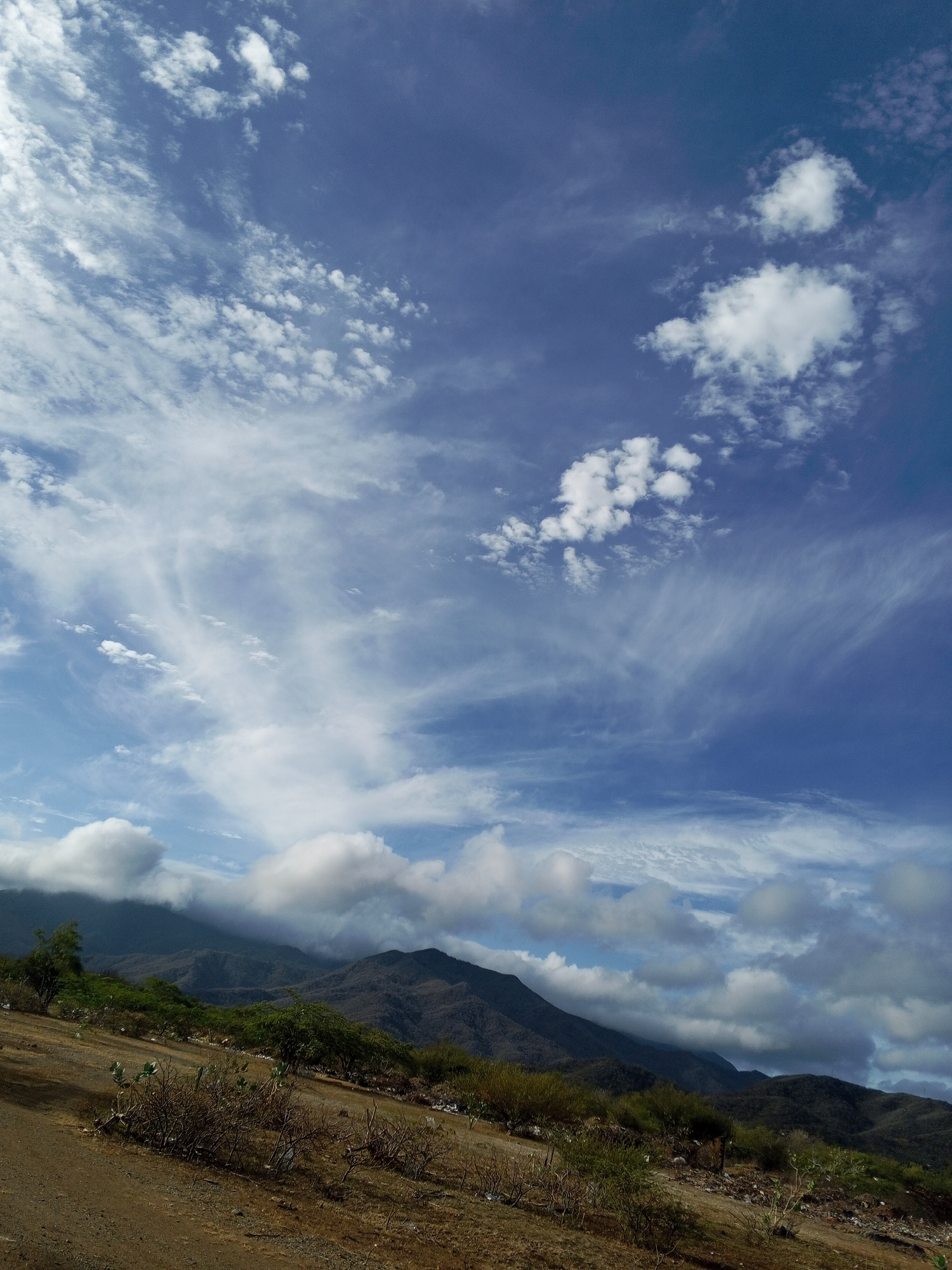 The image depicts a landscape in Altagracia, Venezuela. A mountain range is partially obscured by low-hanging clouds. The foreground shows a dirt or gravel slope with sparse vegetation. The sky is blue with a mix of cirrus and cumulus clouds. There are no people visible in the image. | Open Wire