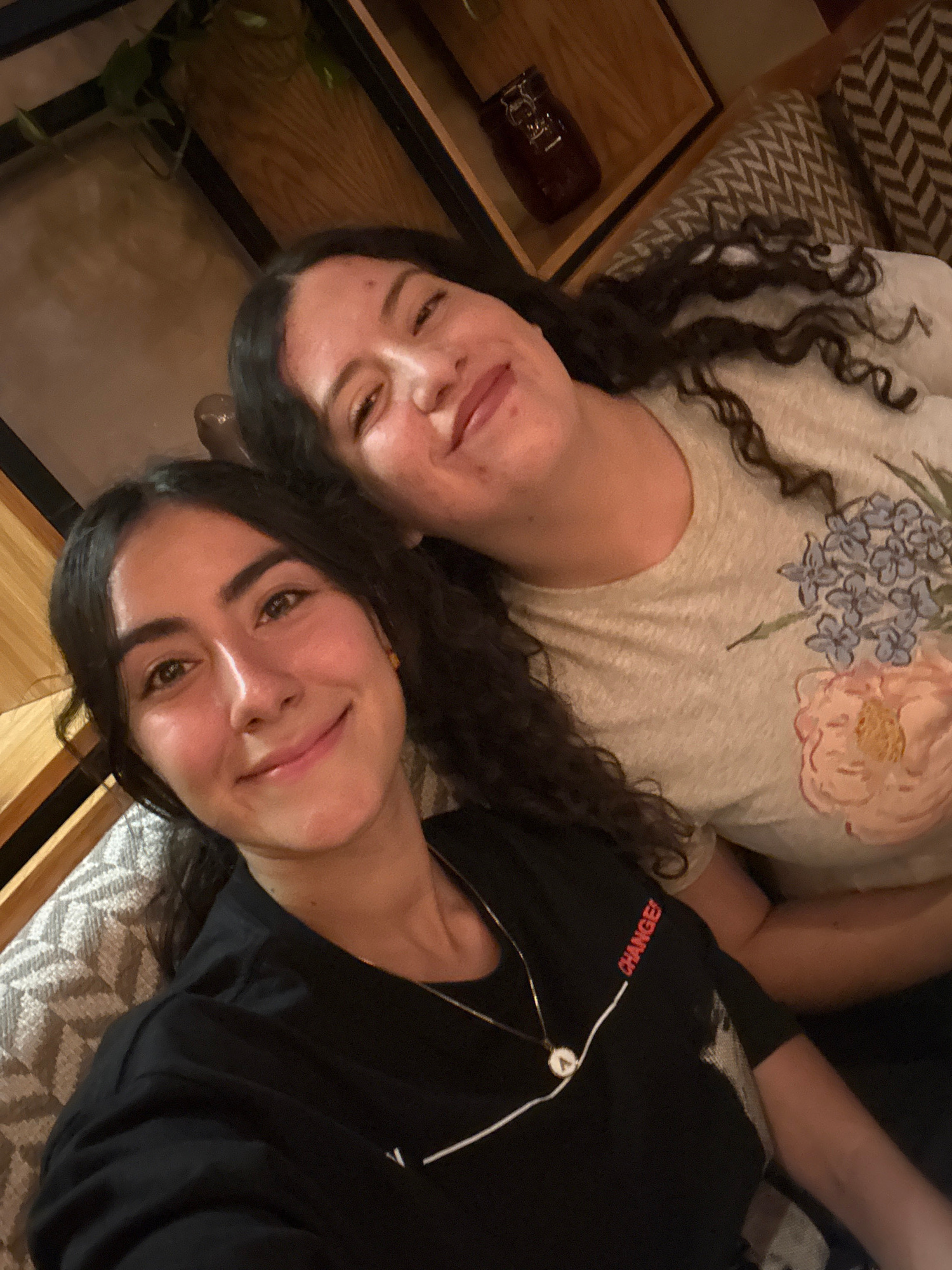 Two women lie side-by-side on a patterned cushion, likely indoors in Puebla, Mexico. The woman on the left has dark curly hair and is wearing a light-colored t-shirt with a floral design. The woman on…read more