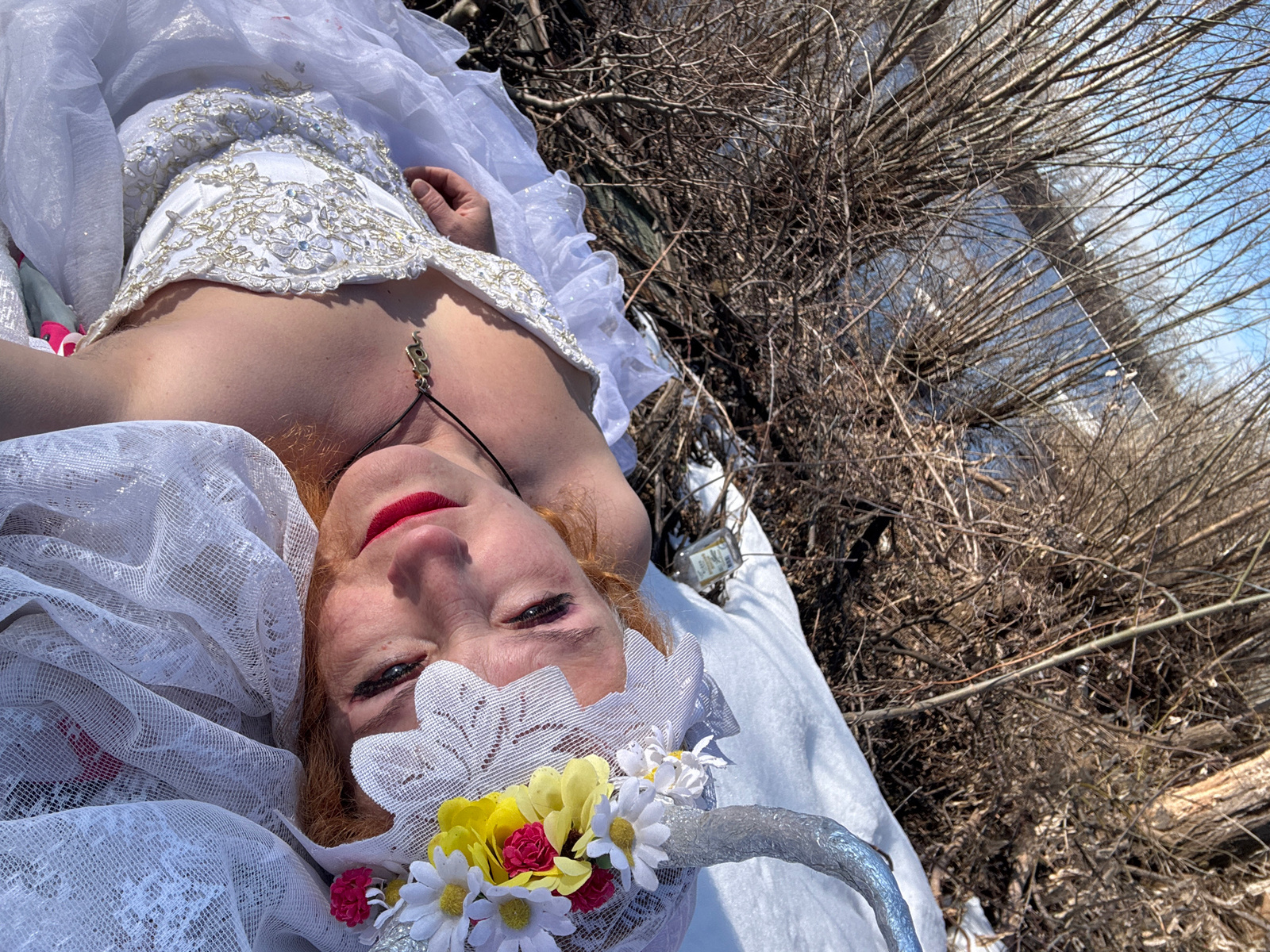 A woman in a white dress and headdress is positioned near a body of water surrounded by bare trees. The woman's headdress is adorned with flowers and silver horn-like attachments. The setting appears…read more