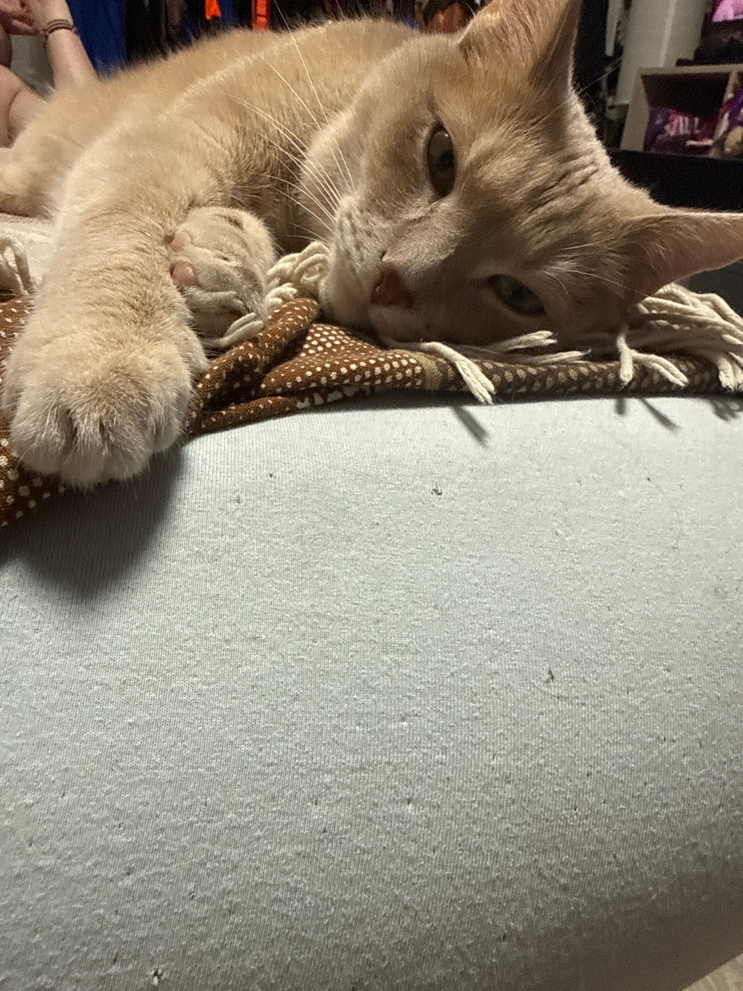 A light orange tabby cat is sitting and resting its paws on a brown and white patterned fabric, with white rope tassels. The cat is next to a large, light gray textured surface. The cat appears to be…read more