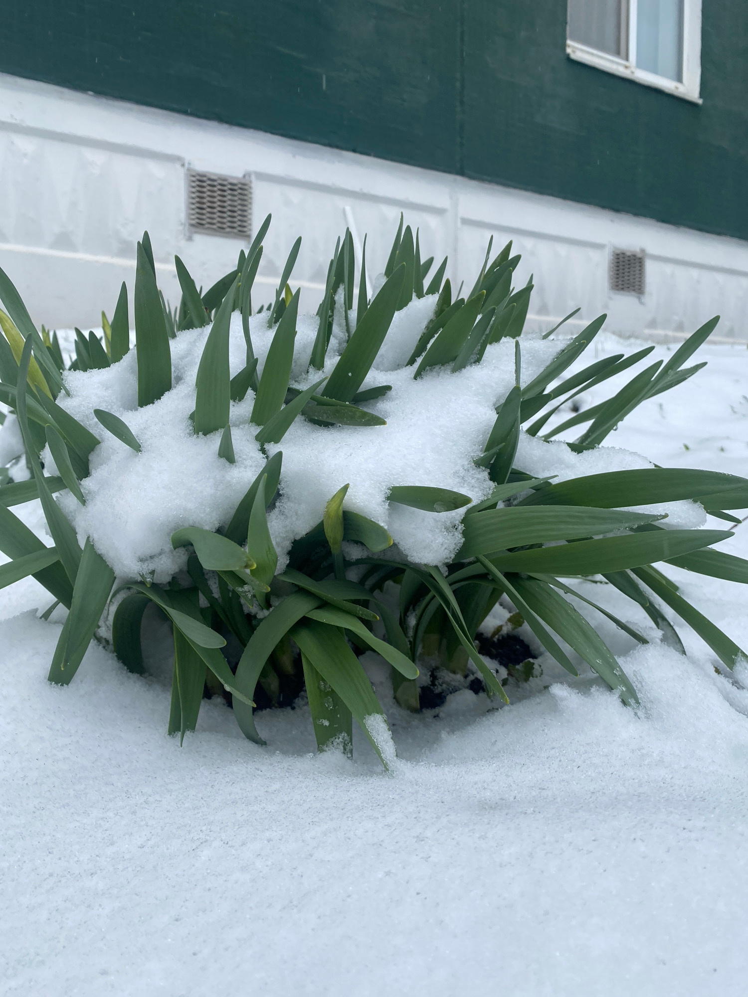 The image shows a clump of green plants partially covered in snow, adjacent to a building. The plants appear to be growing close to the building's foundation. The building has a white exterior with a…read more