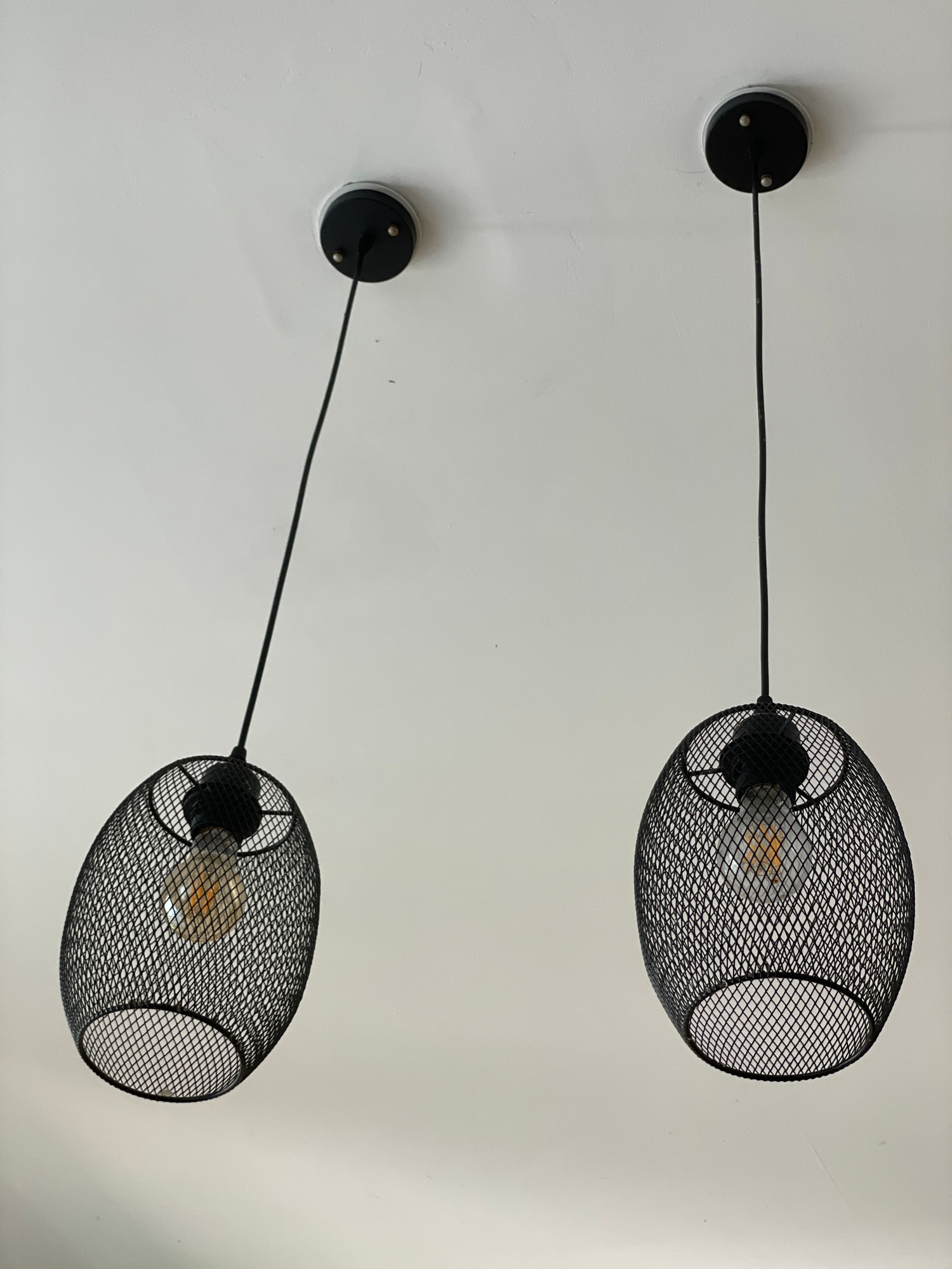 The image displays two identical pendant lights suspended against a plain white ceiling. Each light consists of a small, circular black fixture mounted on the ceiling, from which a thin black electric…read more