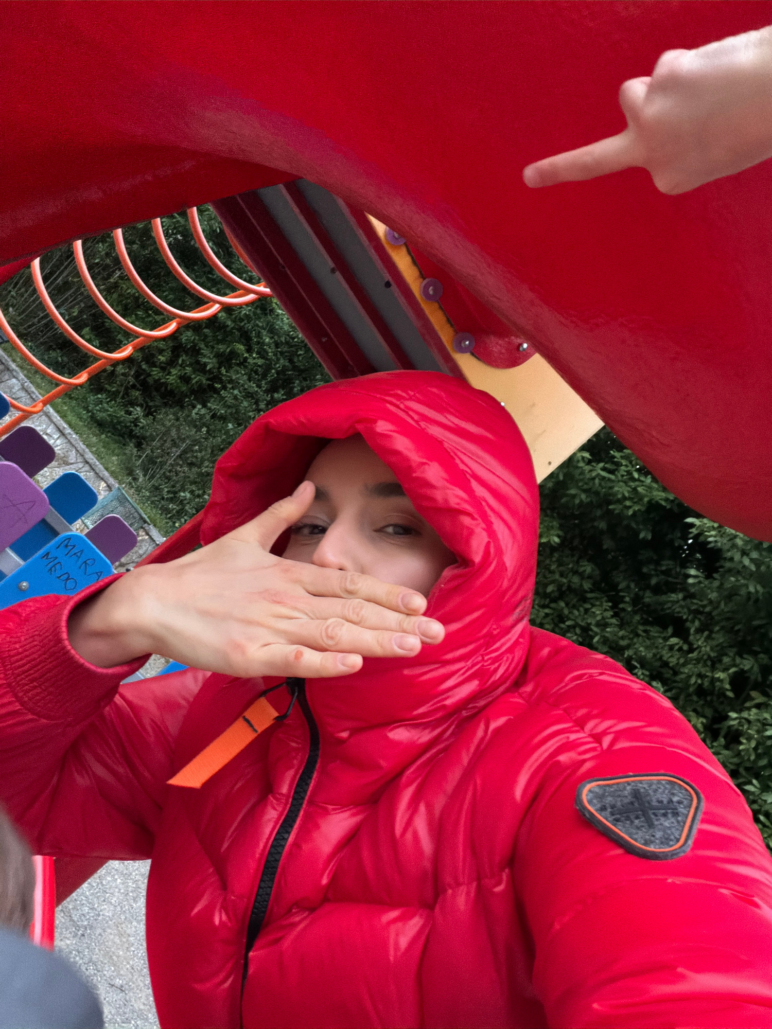 A person wearing a red hooded puffer jacket is partially visible, their face partially obscured by their hand. They are positioned in front of a red playground slide. A child's hand, pointing downward…read more