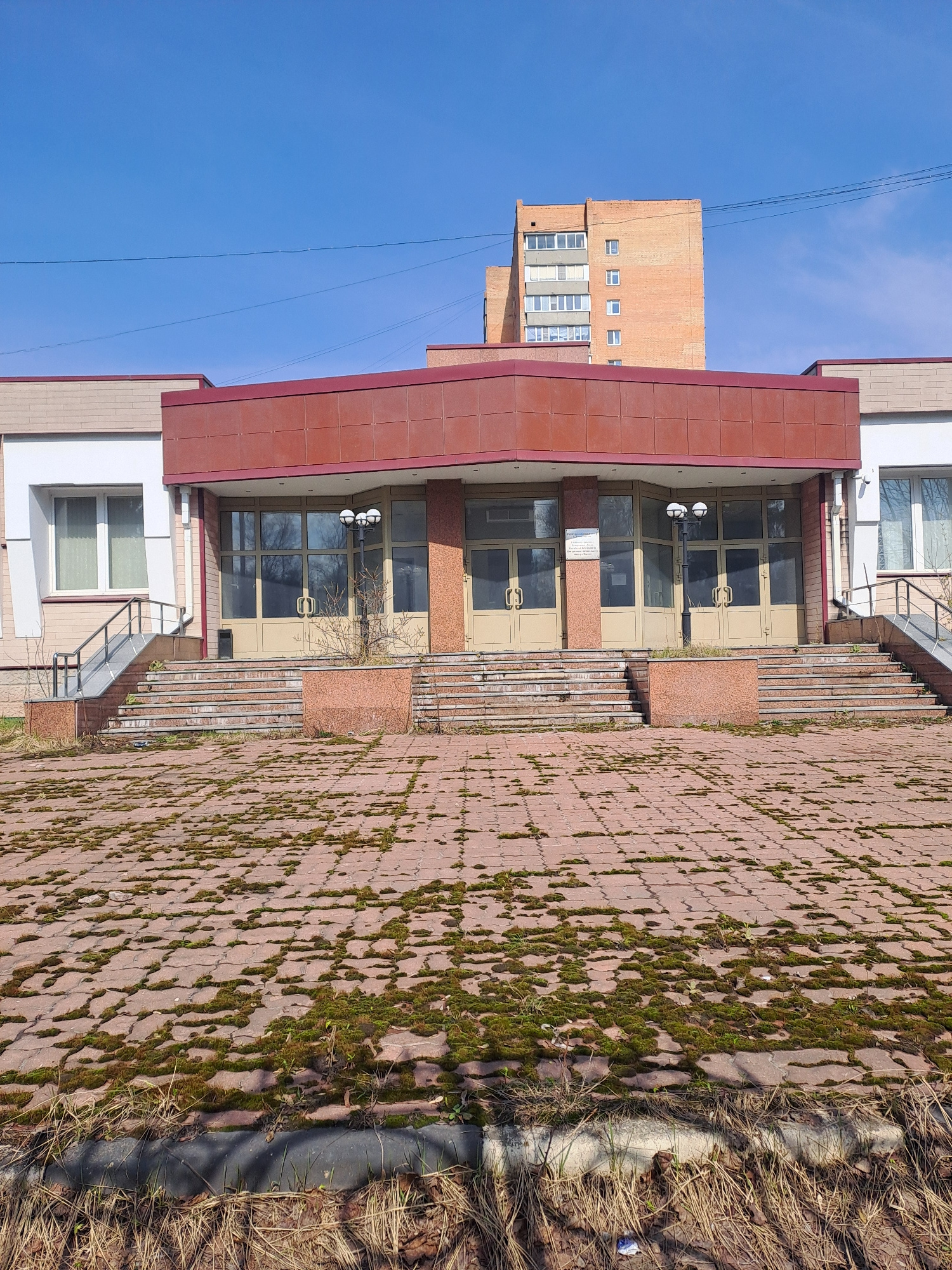 The image shows a building with a brick facade, located in Elektrostal, Russia. The building has large windows and a prominent maroon-colored overhang. A brick walkway, partially covered with moss, le…read more