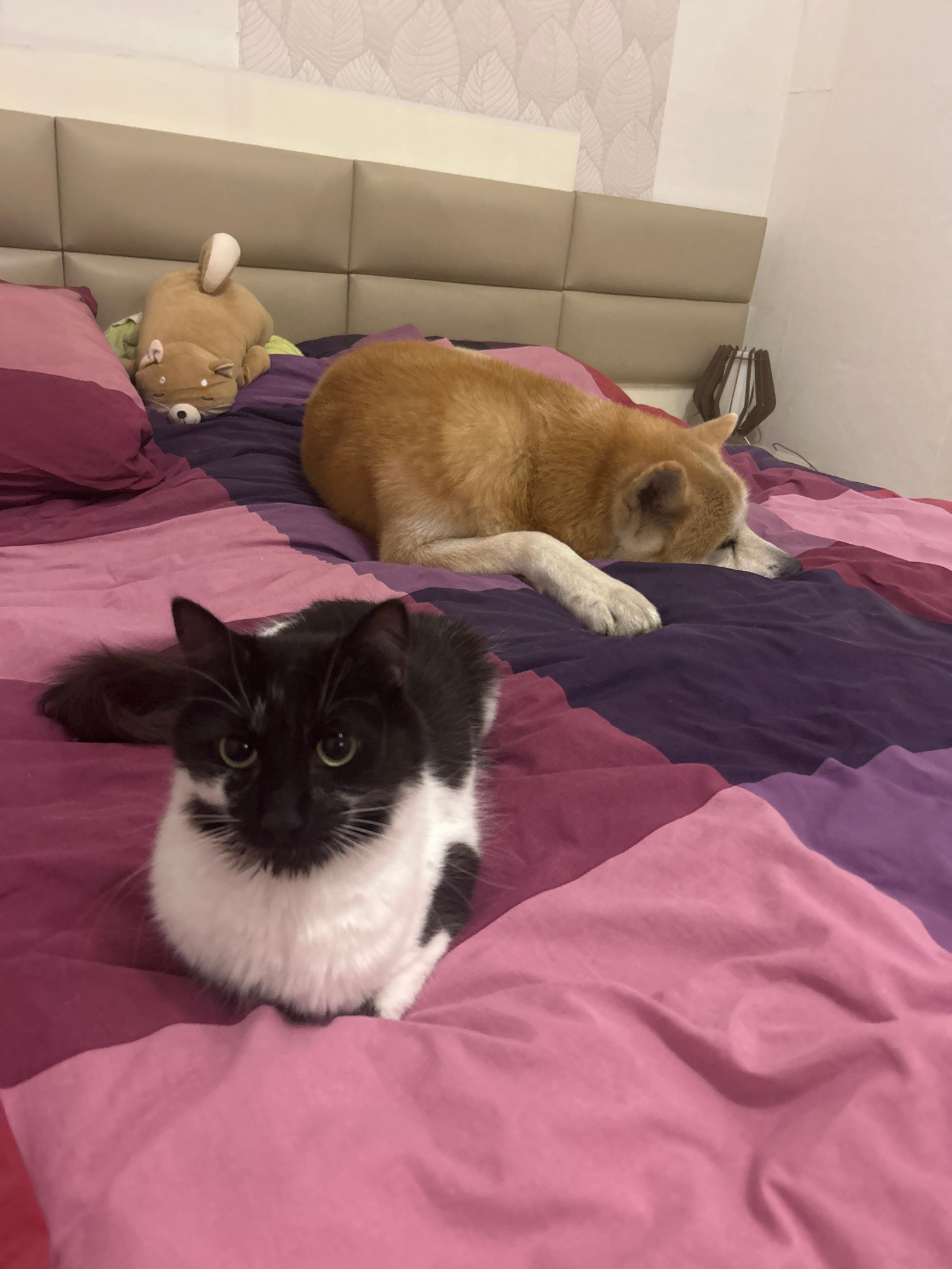 A high-angle shot shows a bed with a tan Shiba Inu-type dog and a black and white cat lying on a striped pink and purple comforter. The dog is lying with its head near a beige headboard and a stuffed…read more