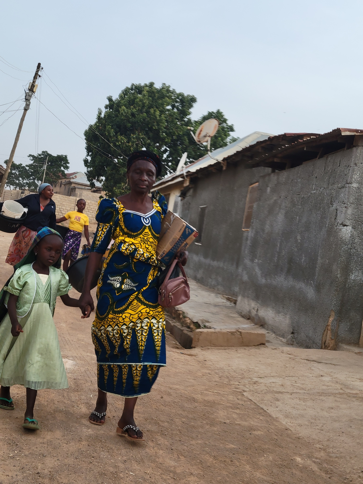 A woman and a young girl are walking hand-in-hand on a dirt path in Jos, Nigeria. The woman wears a blue and yellow patterned dress, black and white sandals, and carries a brown bag and a cardboard bo…read more