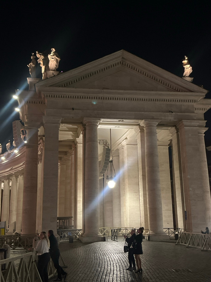 The image depicts a brightly illuminated classical stone colonnade at night, identified as a section of Bernini's Colonnade in St. Peter's Square, Vatican City, an enclave within Rome, Italy. The stru…read more