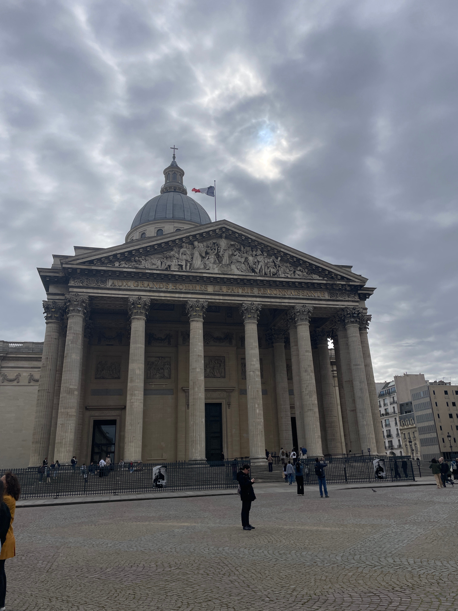 The image shows the Pantheon in Paris, France. It is a large neoclassical building with a dome and a portico supported by Corinthian columns. A French flag is seen atop the dome. People are standing a…read more