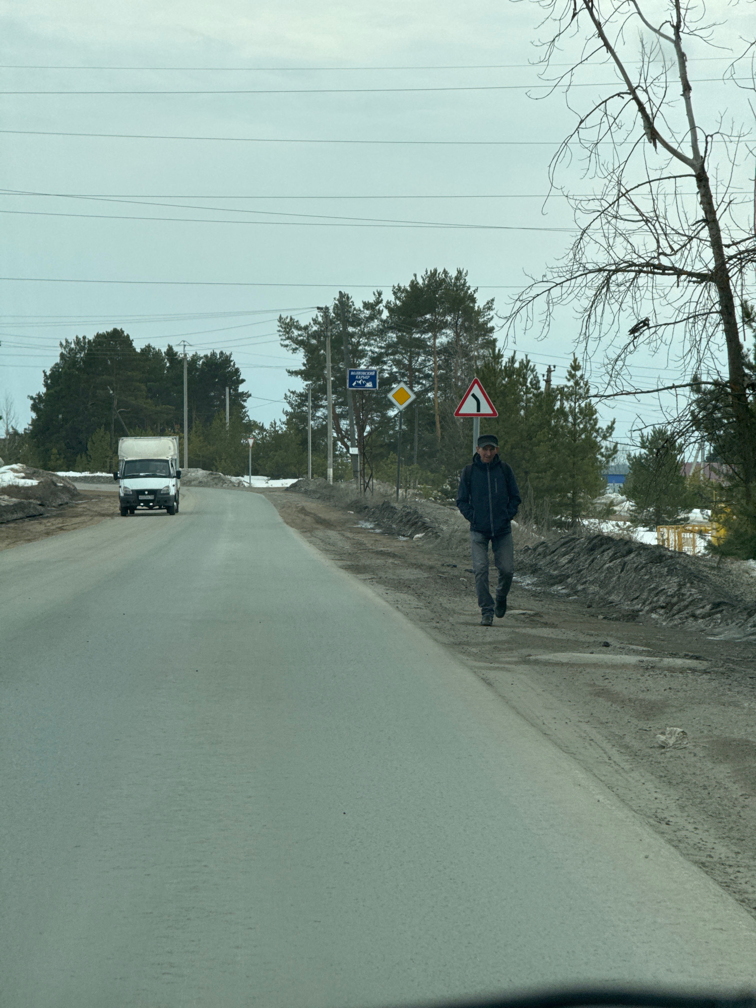 A man in a dark jacket and pants walks along a roadside. A white truck is driving towards the viewer on the road. Several road signs are visible. The location is near Noviy, Russia.