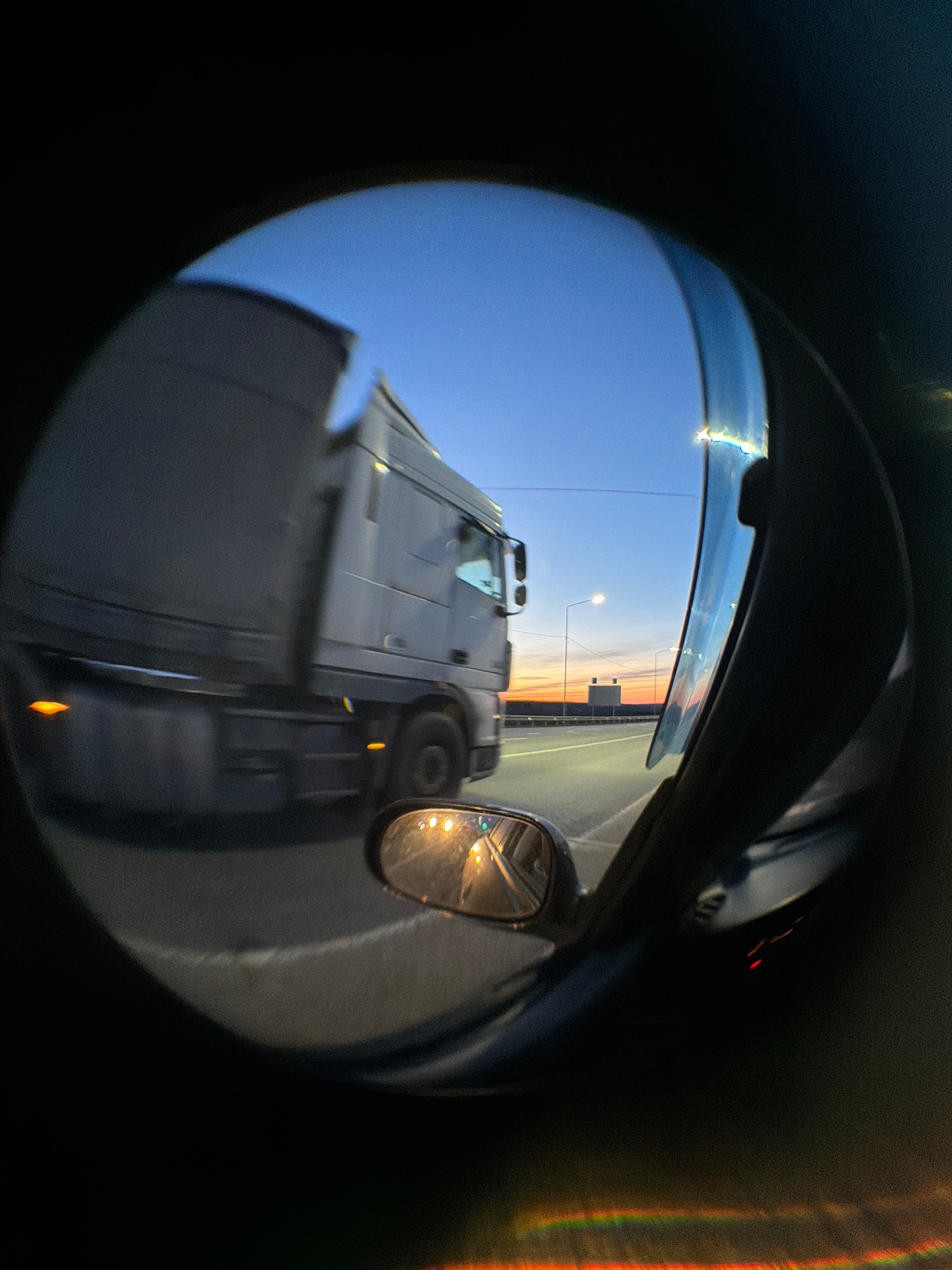A fisheye-lens perspective from inside a vehicle shows a large white truck passing on a highway. The sky is visible with the last vestiges of a sunset, and streetlights are illuminating the road. A si…read more