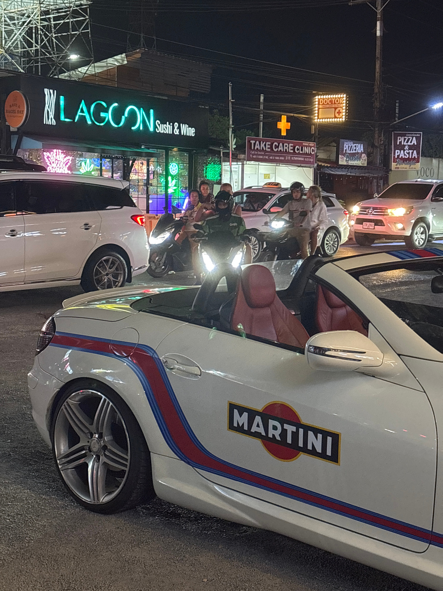 The image depicts an urban street scene at night in Choeng Thale, Thailand, identified by the "Lagoon Sushi & Wine" restaurant sign. A white car, prominently displaying a Martini logo, is parked alongβ¦read more
