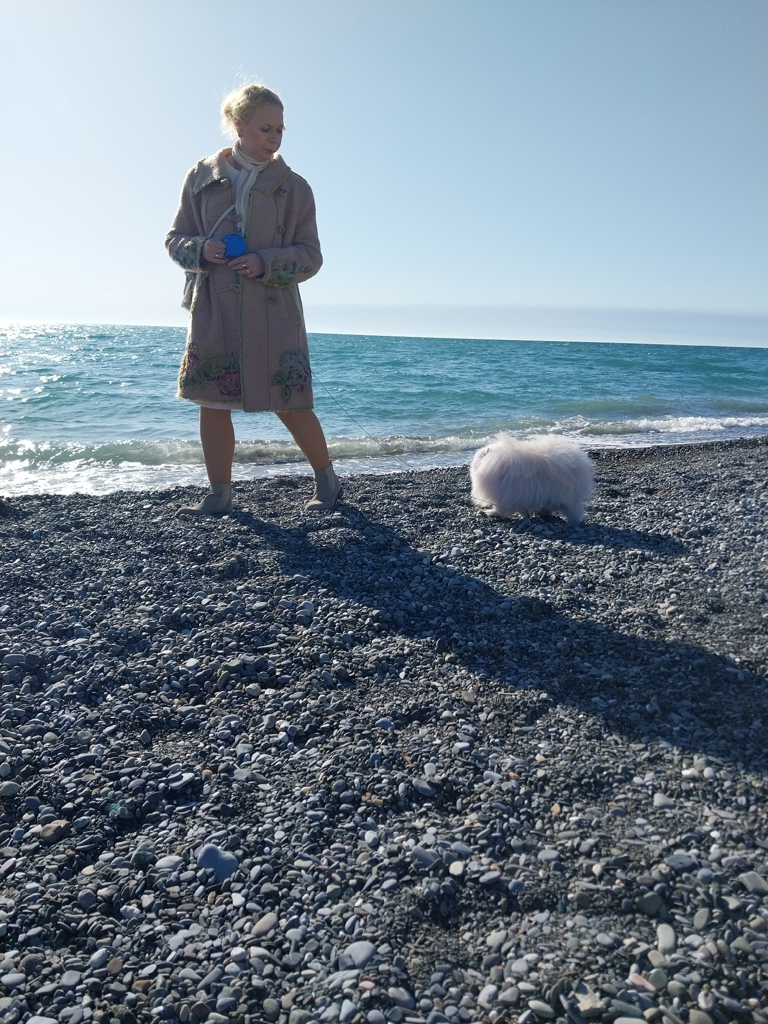 The image depicts a tranquil coastal scene on a pebble beach in Sochi, Russia. A woman and a fluffy white dog are the central subjects, positioned along the shoreline under a clear blue sky. The woma…read more