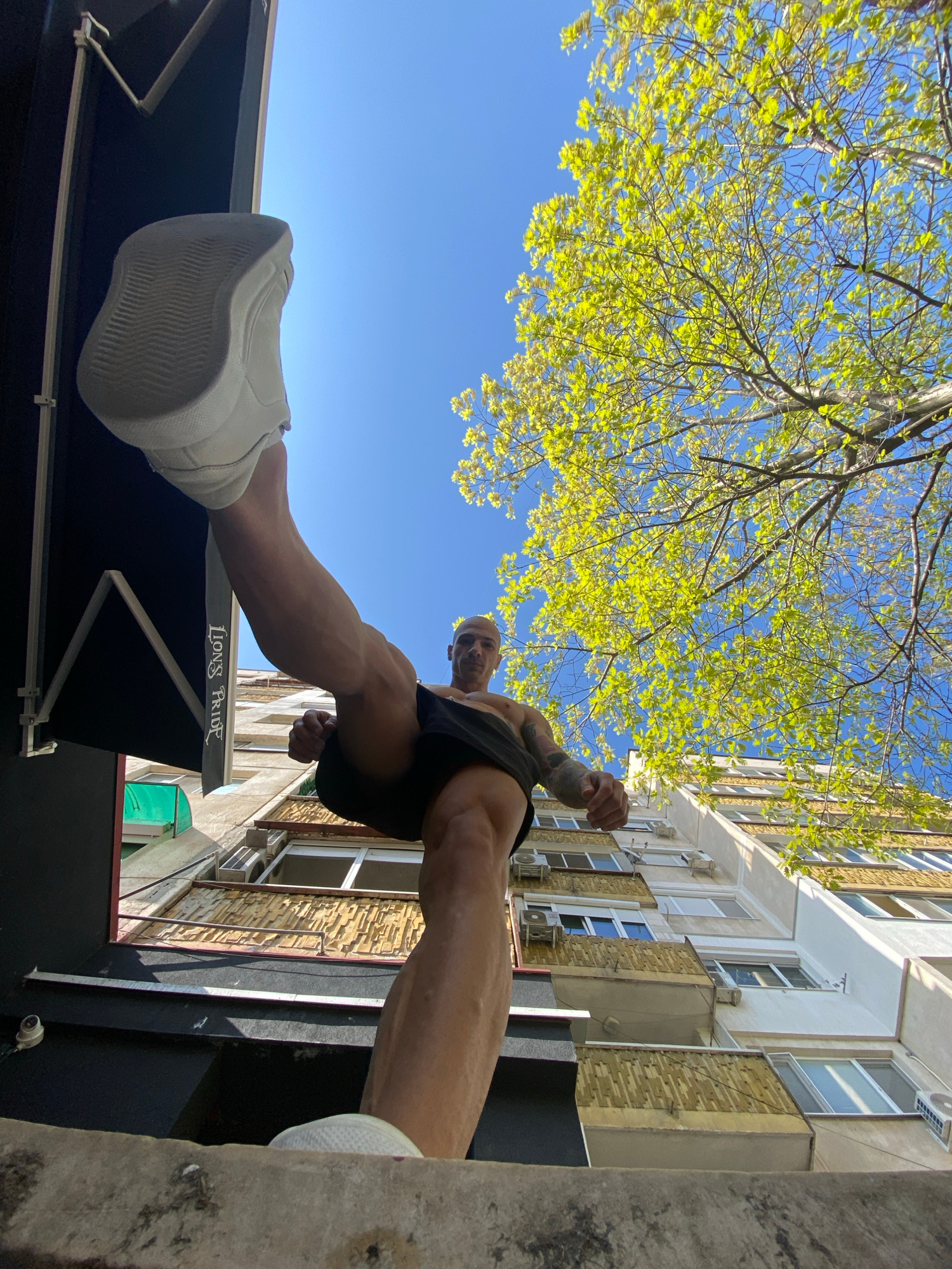 An extreme low-angle shot captures a muscular individual in an athletic pose, seemingly suspended or stepping over an awning. The person, likely male, is seen from below, wearing a dark sleeveless topβ¦read more