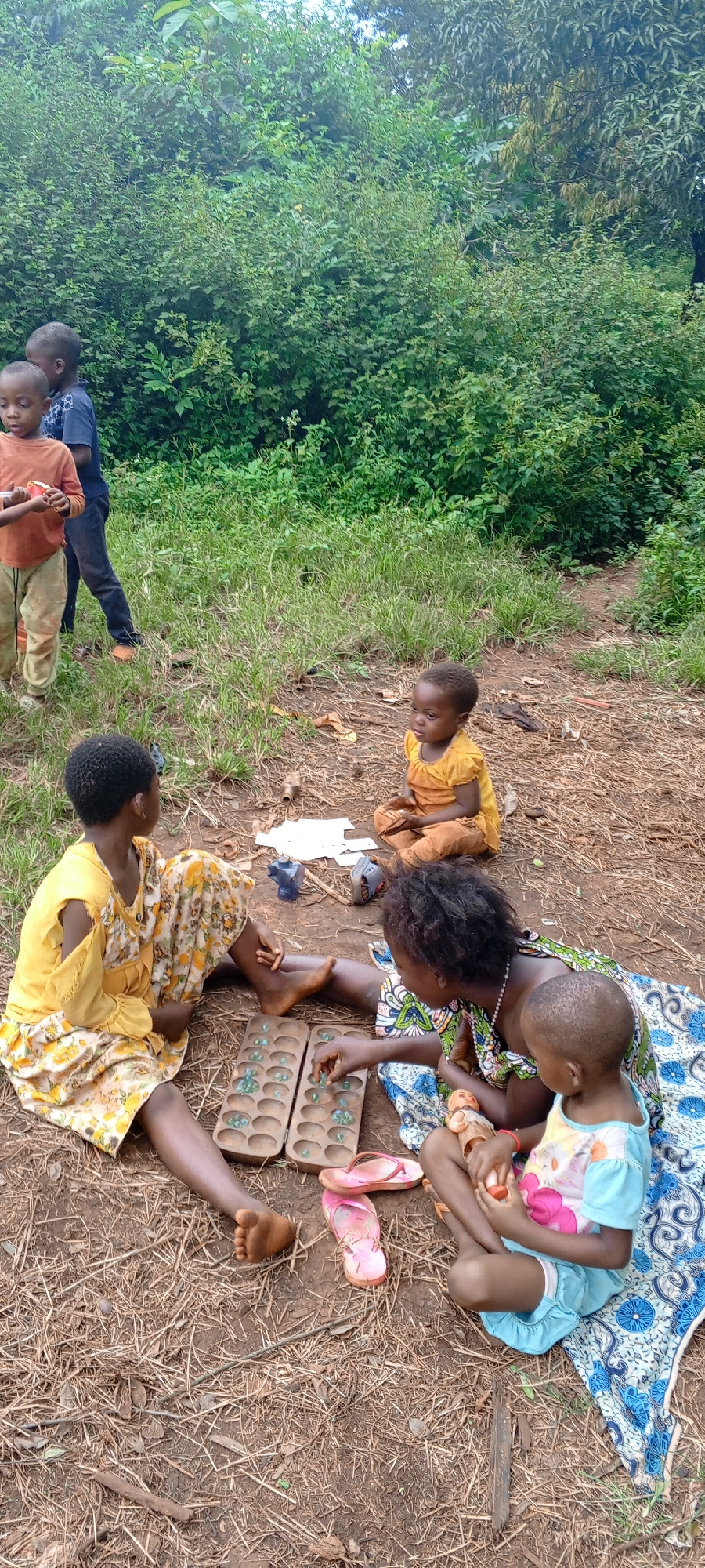 In Ngalula, Democratic Republic of the Congo, a group of children and an adult sit on the ground in an outdoor setting. An adult sits with one child on a blue and white cloth; an additional child sits…read more