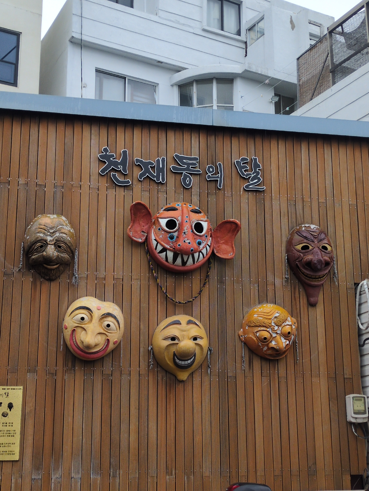 This media file captures a vibrant outdoor scene in Ulsan, South Korea, featuring a wooden building facade adorned with multiple traditional Korean Hahoe masks. The image is taken at an oblique angle,…read more
