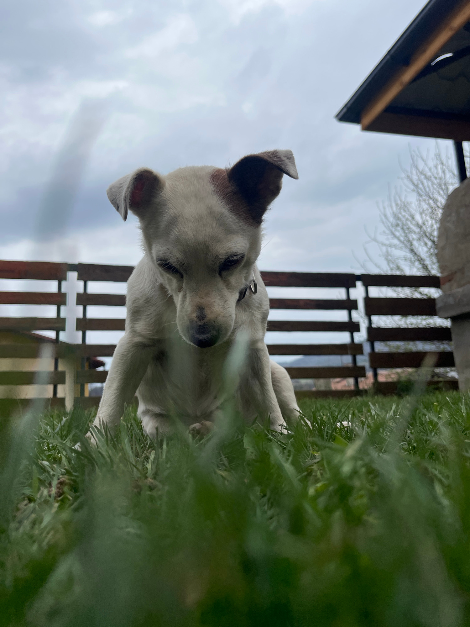 The media file displays a low-angle shot of a light-colored dog, possibly a puppy, situated outdoors. The dog, predominantly white or cream with hints of brown on its ears, is captured in a relaxed po…read more