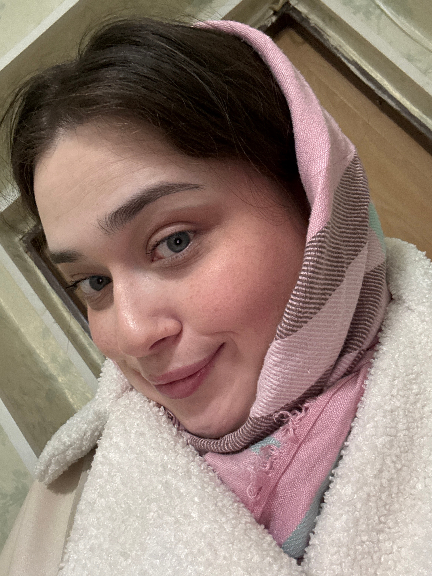 A close-up portrait features a young woman's face, angled upwards and slightly to the right, with her head tilted. She has blue-grey eyes, dark, well-defined eyebrows, and light skin with a natural co…read more