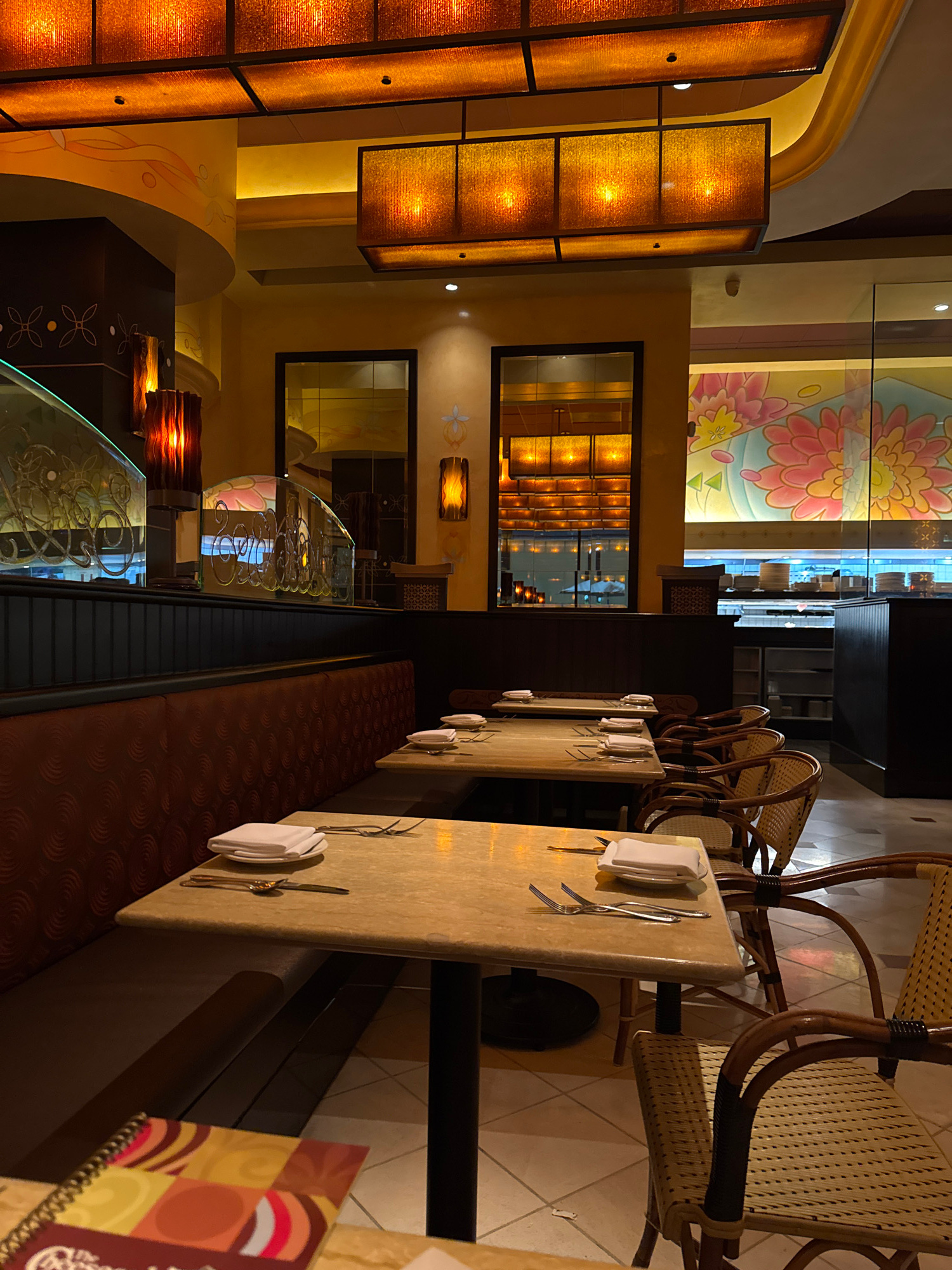 The image shows the interior of a restaurant with tables set for dining. The tables are long and narrow, with light-colored surfaces and place settings including napkins and silverware. A bench with dā¦read more