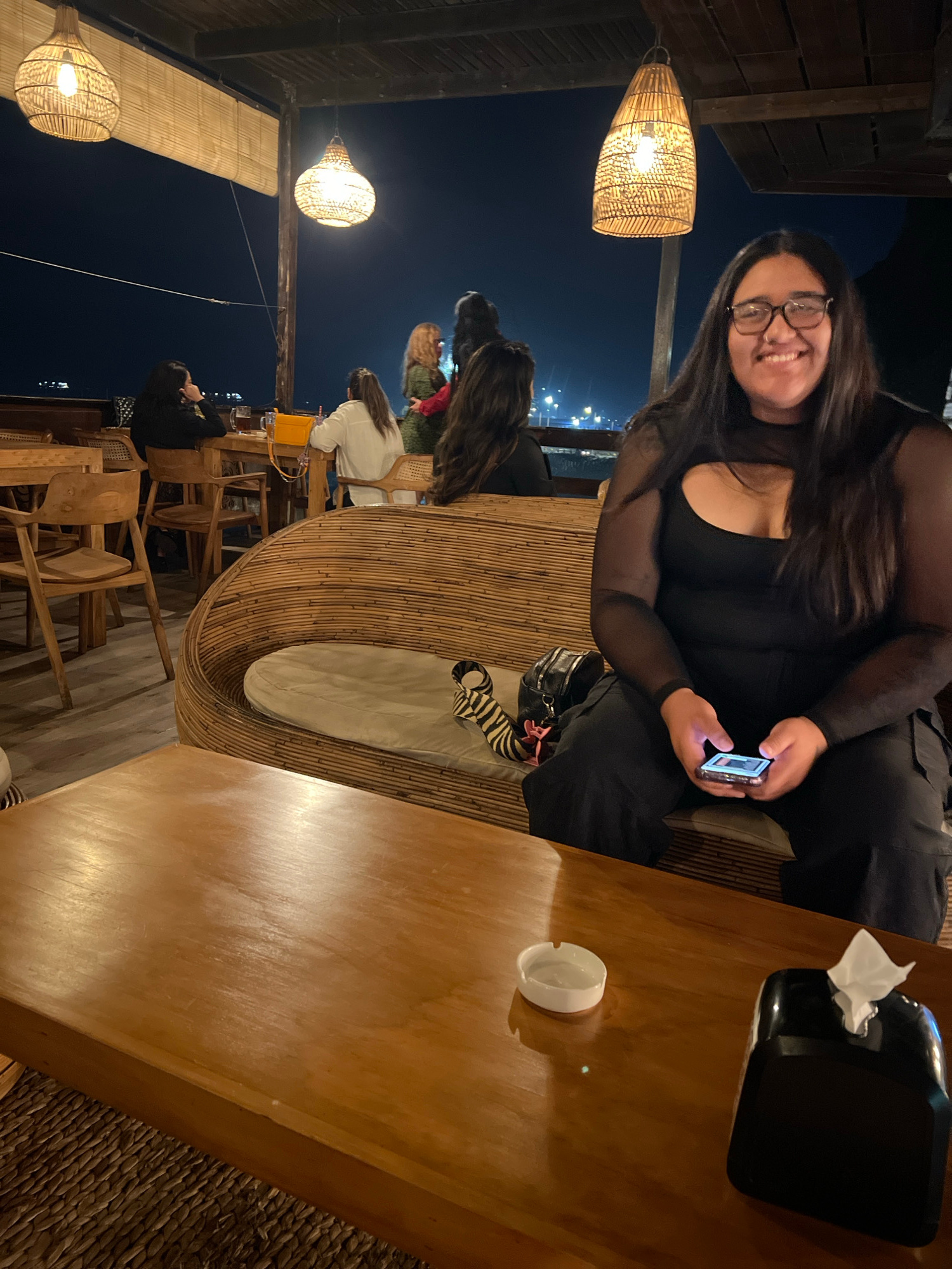 Here is a description of the image: The image depicts an indoor/outdoor setting, likely a restaurant or bar in Arica, Chile, given the lighting and ambiance. A woman is seated, smiling and holding a…read more