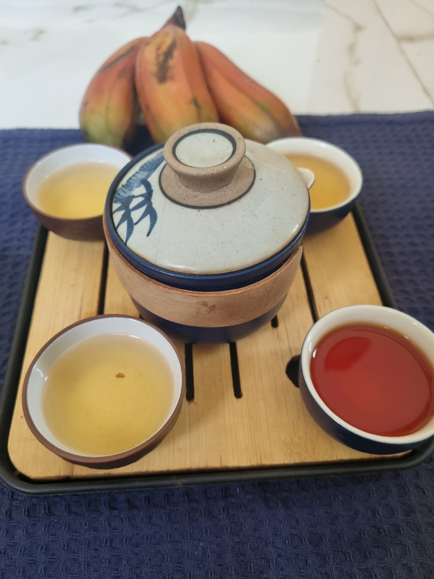 On a wooden tray atop a blue textured surface lies a tea set consisting of a teapot and four teacups. The teapot is decorated with a white lid bearing blue floral patterns. Two teacups contain a light…read more
