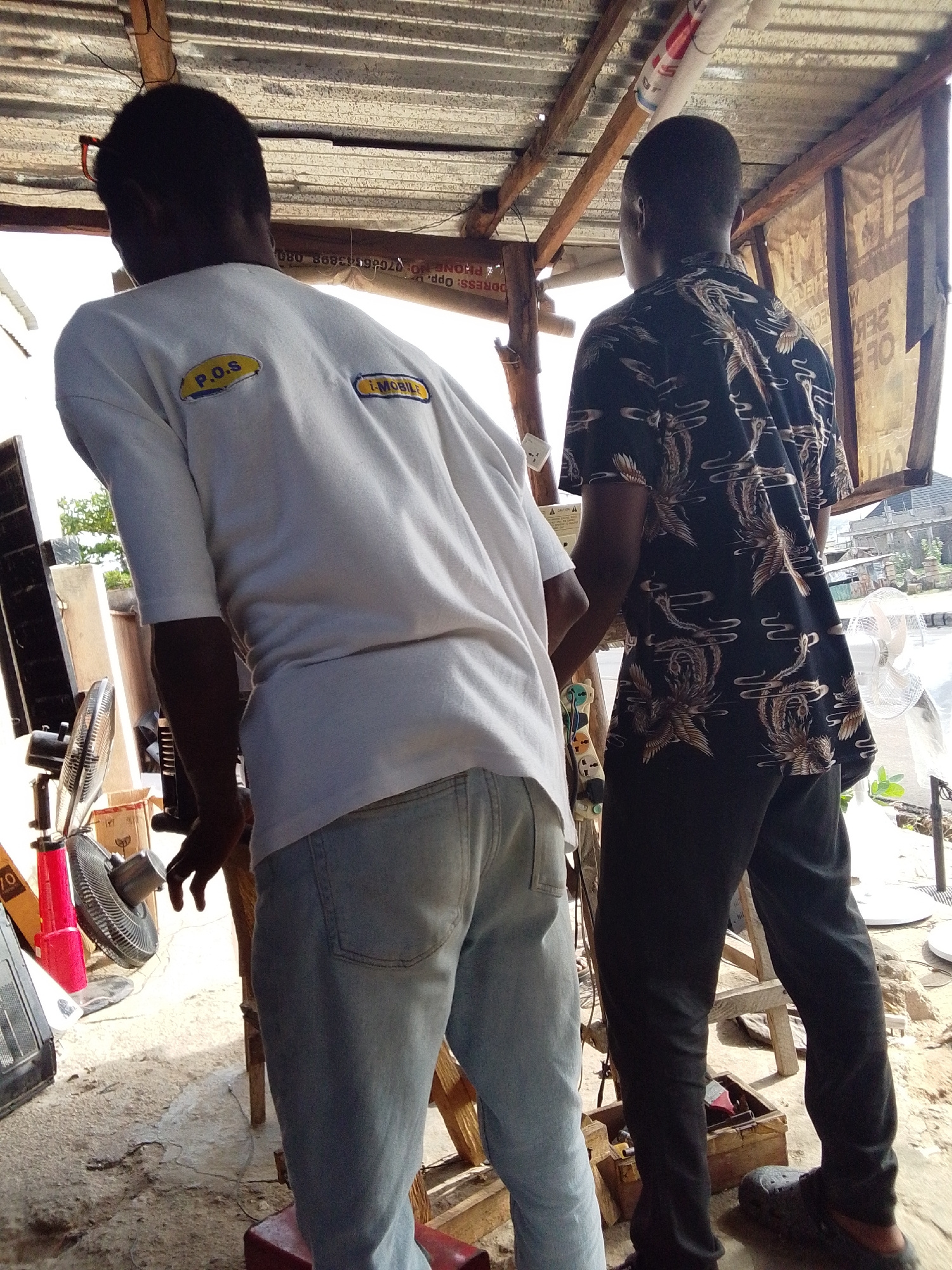 Two men stand under a makeshift structure with a corrugated metal roof and wooden supports. The man on the left wears a white t-shirt with "P.O.S" and "I-MOBILE" labels, blue jeans, and faces away fro…read more