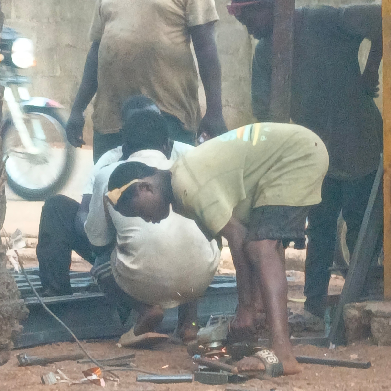 This full-shot image captures several men engaged in metalworking outdoors in what appears to be an informal workshop in Akwanga, Nigeria. In the foreground, a man wearing a light-colored t-shirt and…read more