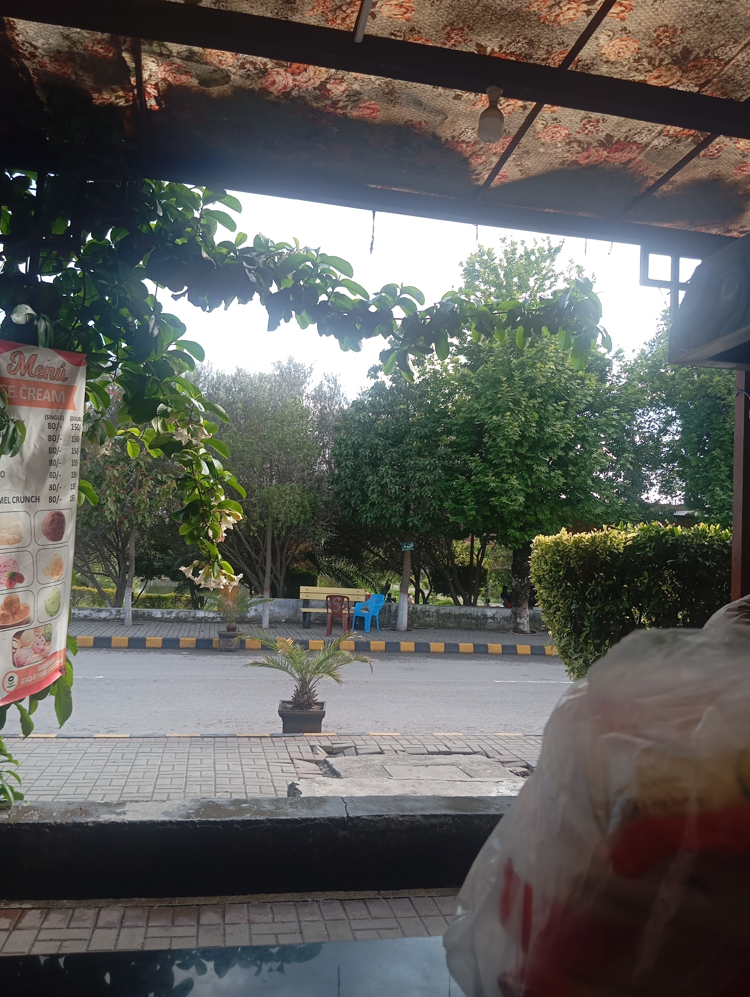 The image shows a view from what appears to be an outdoor or semi-enclosed seating area, likely of a small eatery, in Chah Sultan, Pakistan. A printed menu, advertising ice cream flavors and prices, i…read more