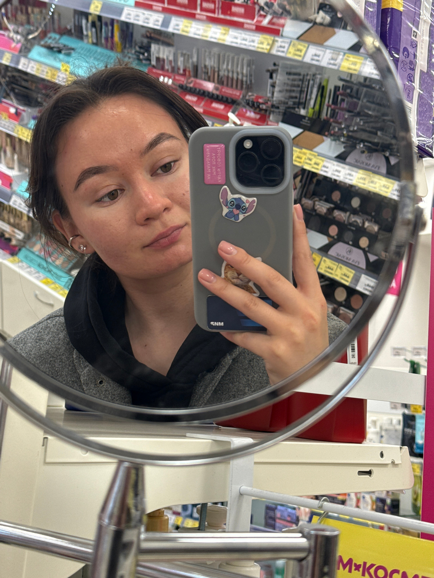 A young woman is taking a mirror selfie, likely in a cosmetics store in the city of Chaikovsky, Russia. She is holding a gray phone with stickers on the back (Stitch and a cat). The mirror shows shelv…read more