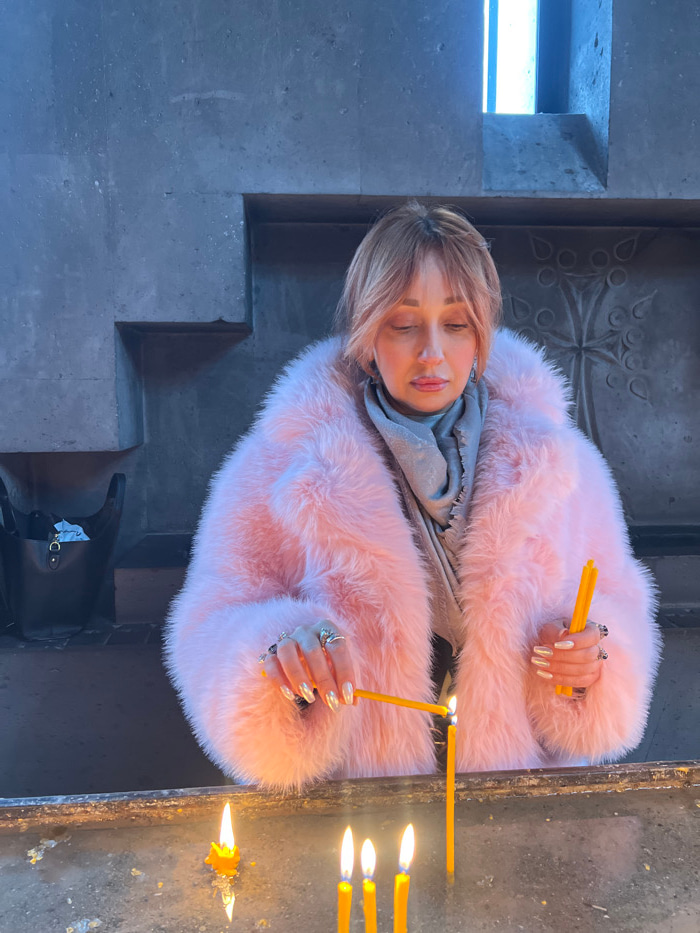 A woman is depicted in a mid-shot inside a stone-walled structure in Vagharshapat, Armenia. She has light-colored hair with bangs, and her eyes are directed downwards. She is attired in a voluminous, light pink faux fur coat and a grey fringed scarf. Her fingernails are long and manicured with a light, reflective polish, and she wears multiple rings on her fingers. She holds two thin, yellow candles; with her right hand, she is in the process of lighting an unlit candle by touching its wick to the flame of a lit candle held in her left hand. Several additional lit yellow candles stand upright in a shallow, rectangular stone basin, where melted wax is visible. The background wall is constructed of rough-hewn grey stone blocks. A dark, possibly leather, handbag is visible on a lower ledge to the left. A deeply recessed rectangular window aperture, emitting bright, cool light, is positioned to the upper right. Centered behind the woman, a carved stone panel displays an intricate, stylized cross-like or floral pattern. The scene is illuminated by the warm glow of the candles and the light from the window. | Open Wire