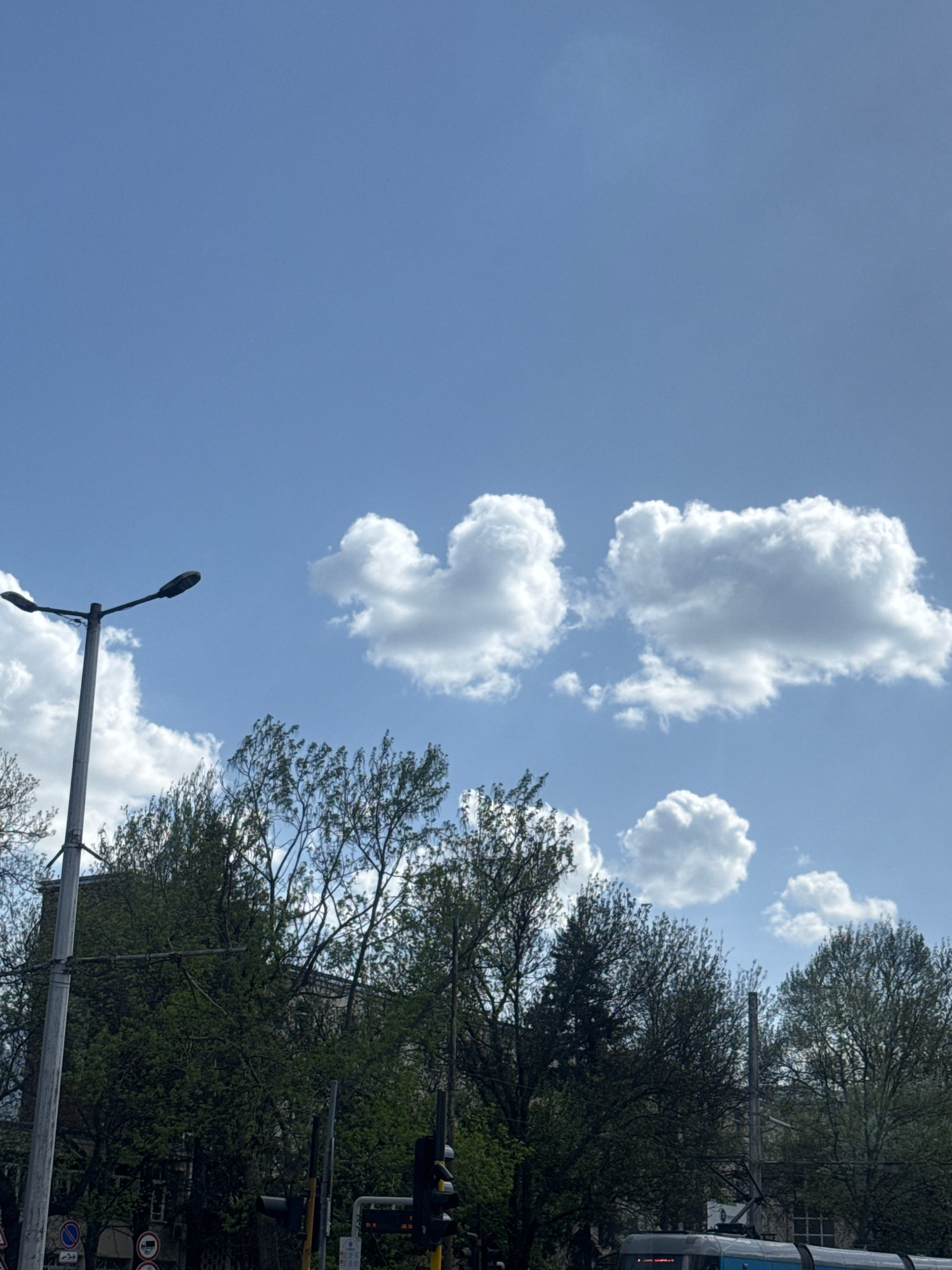 The image presents a bright, sunny daytime scene captured in an urban or suburban setting. The upper and left portions of the frame are dominated by a clear, light blue sky scattered with several whit…read more