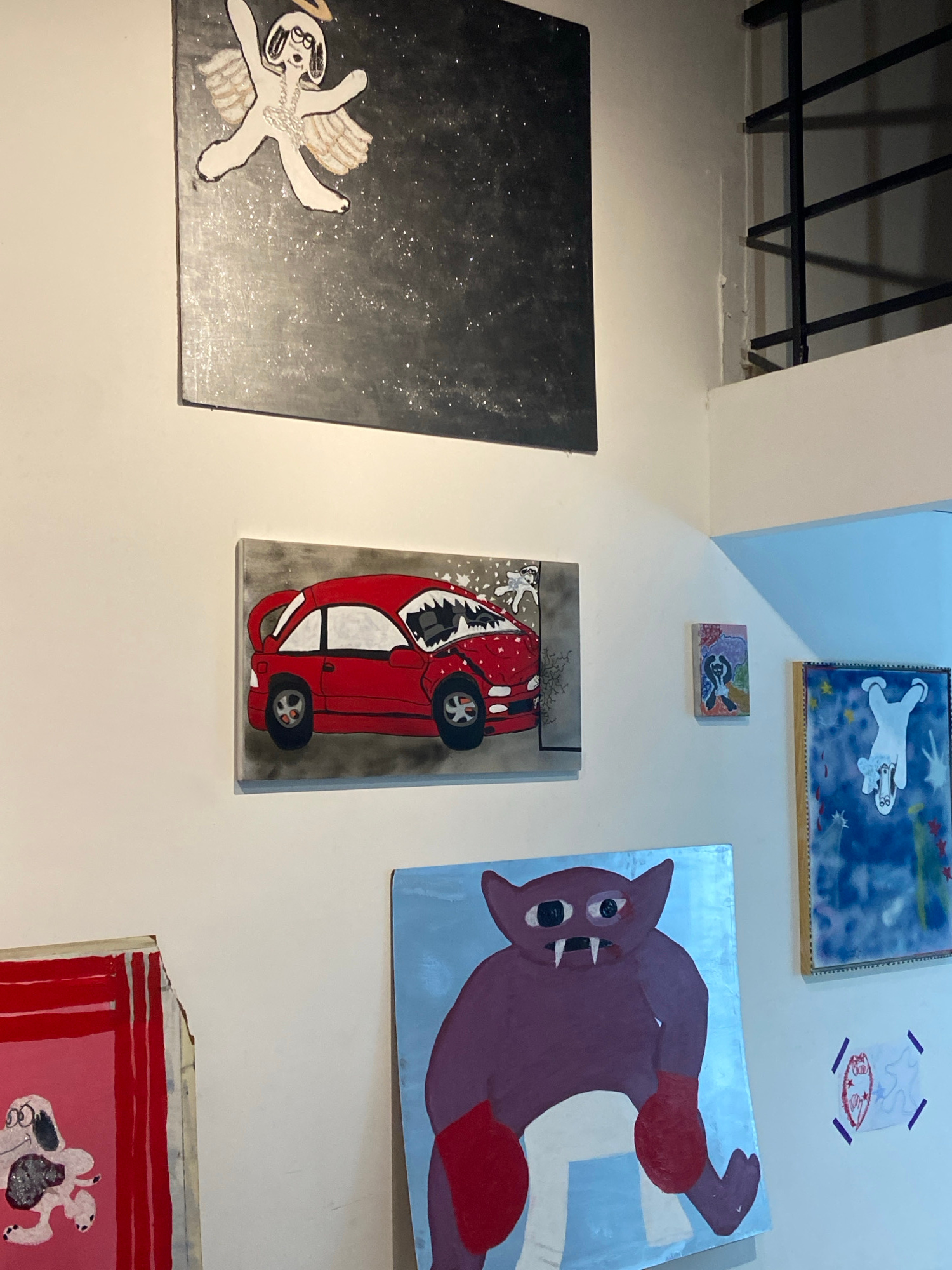 The image shows a section of a white wall in an art gallery or exhibition space. Several framed paintings are hung on the wall. Starting from the left, there is a black painting with a white cartoon f…read more