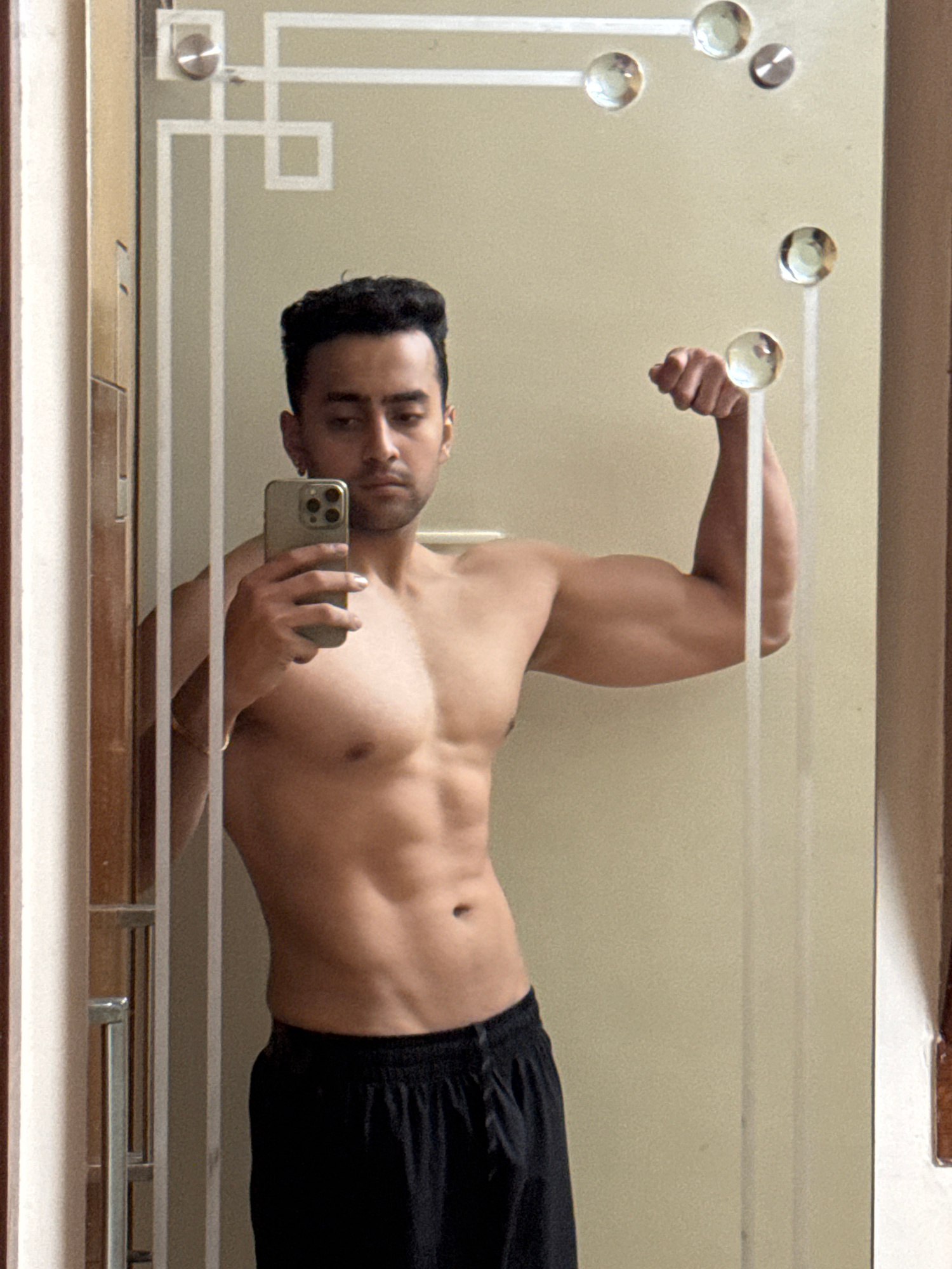 The image displays a shirtless man taking a mirror selfie, presented horizontally such that he appears to be lying on his side. The man, likely in his 20s or 30s, has short dark hair, a light beard, a…read more