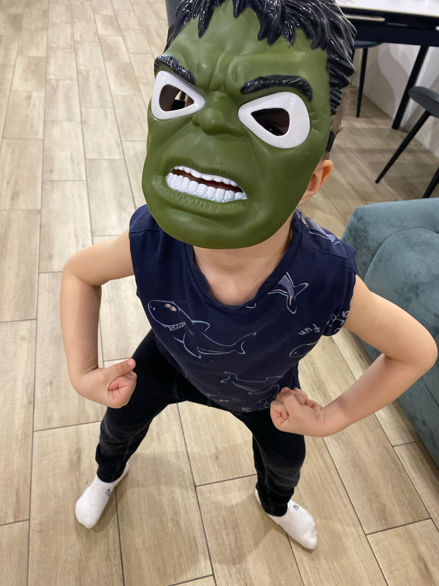 A child wearing a green Hulk mask and a blue shirt with shark designs is standing on a light brown wood-look tile floor. The child is wearing black pants and white socks and is flexing both arms. Ther…read more