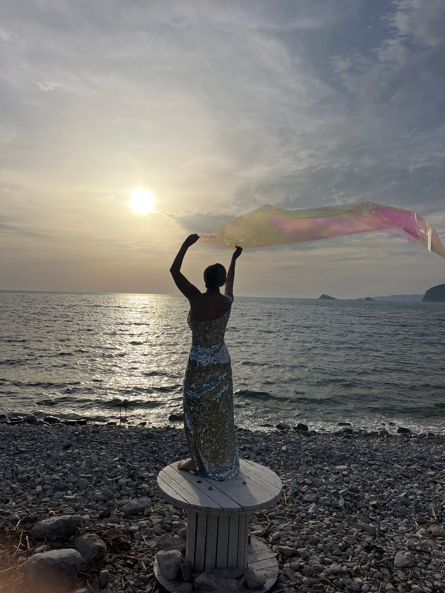 The photograph, taken in Buljarica, Montenegro, depicts a captivating coastal scene at either sunrise or sunset. A person, presented as a graceful silhouette, stands on a large, round wooden spool ser…read more