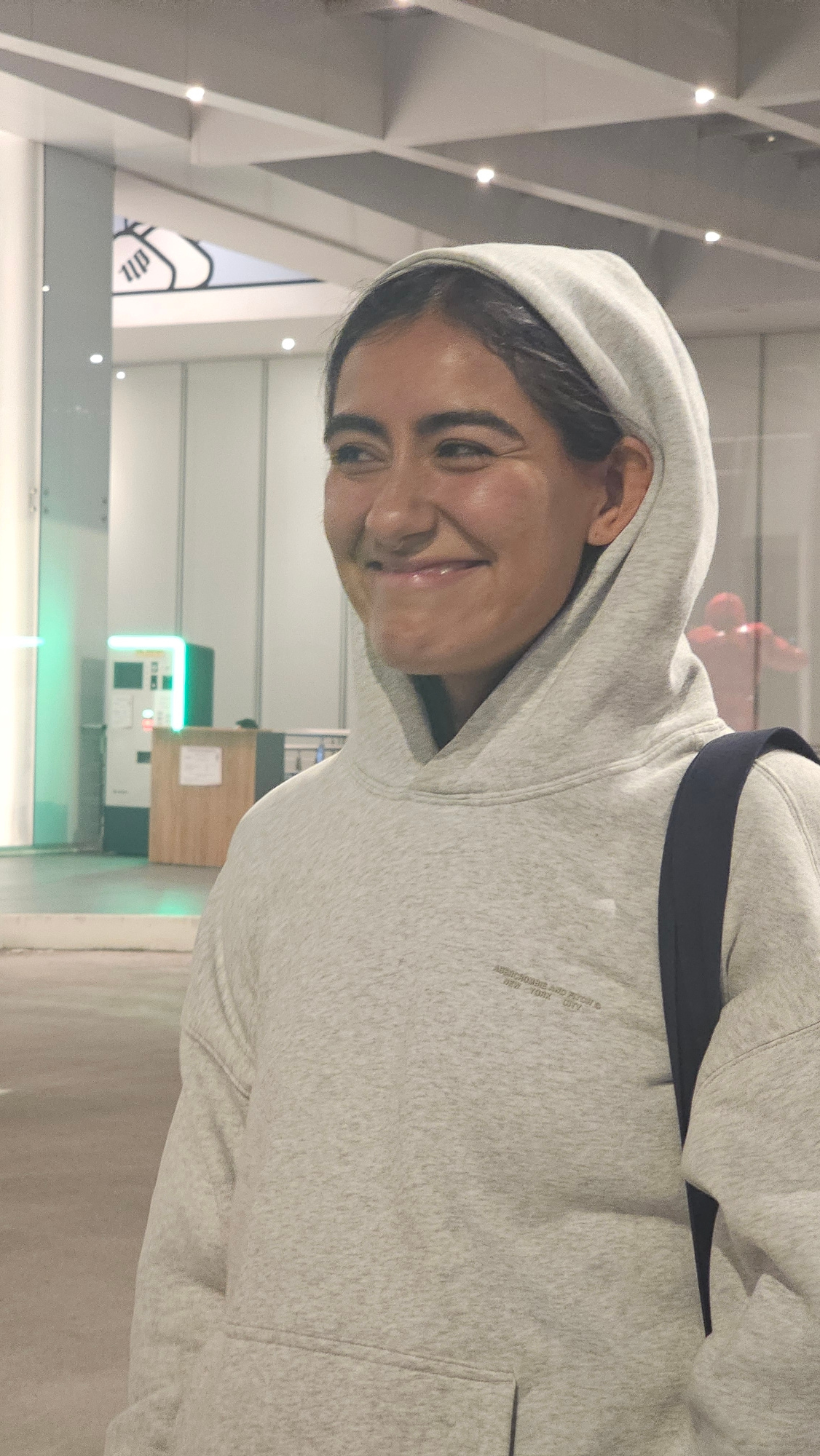 A woman in a gray hoodie with a dark blue backpack strap visible at the top of her shoulder is smiling at the camera. The hoodie appears to be branded with the words "ABERCROMBIE AND FITCH NEW YORK CI…read more